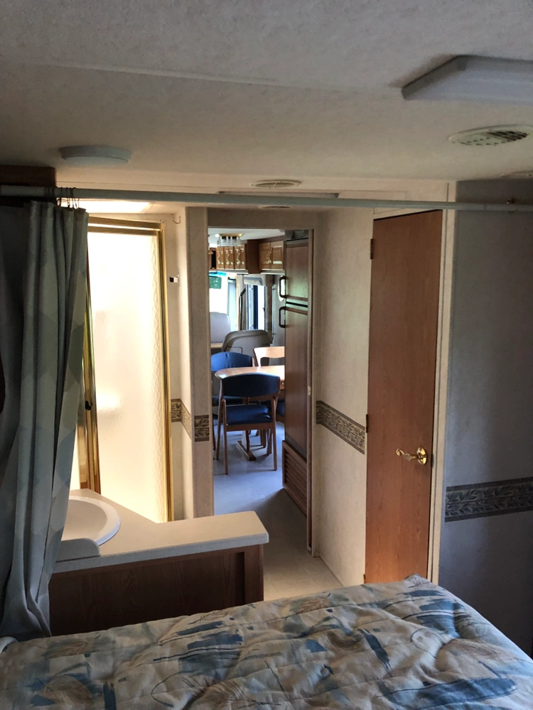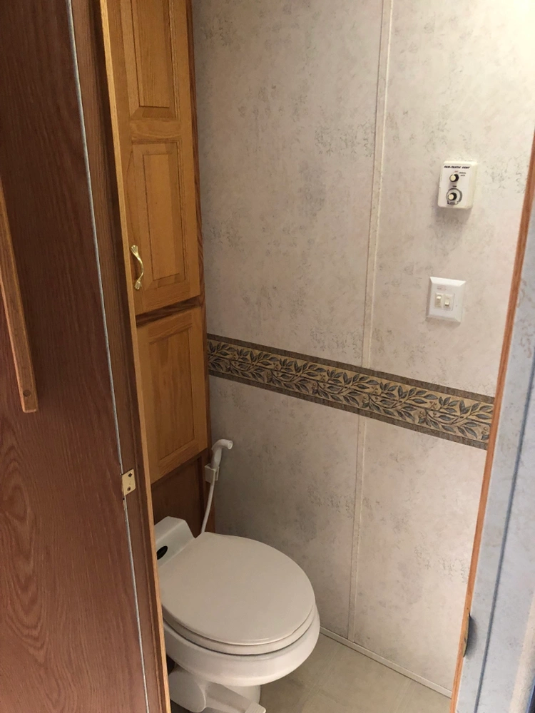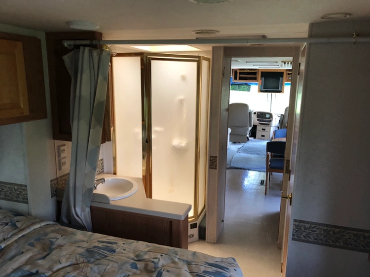 Beyond the dining and kitchen area is the bathroom sink, counter and shower. Across the aisle is a separate toilet area. The bathroom area can be separated by a pocket door next to the fridge. The queen bed on a second slide-out is located just beyond the bath sink area. In this area many drawers and cabinets are available as well above and beside the bed. Across the rear is a full width mirrored closet.