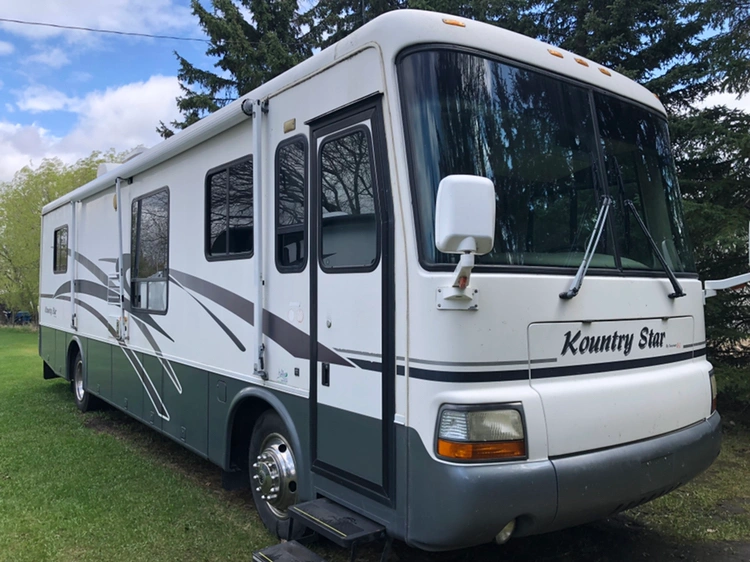 2001 Newmar Kountry Star Model KSPD 3667 Freightliner Chassis Diesel Pusher, Cummins ISB 300 HP, Allison 6 speed Automatic transmission. Air Brakes, Jake brake, Unit has Cummins Onan LPG 5500 watt generator (< 40 hrs run time), 400 watt inverter, two (2023) 12-volt chassis batteries; two (2023) 6-volt deep cycle house batteries. 81,500 km. The unit has a solar panel battery charging system currently set to charge the house batteries. Four solid stabliizer jacks controlled at the driver’s station. New (2024) alternator and wiring harness, new rear air brake modulator (fall 2023), full storage basement. The unit can easily handle any towed vehicle you wish to pull. The unit has been Quonset stored (winter) for the past 10 years.