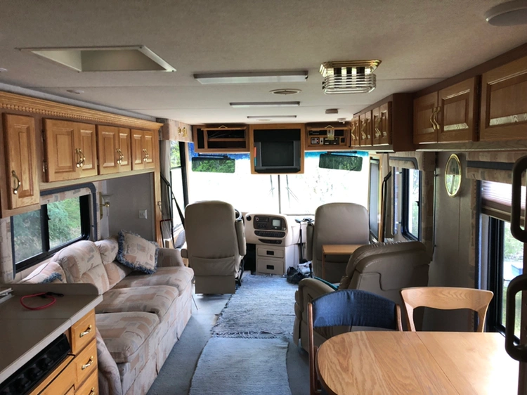 All cabinetry is solid oak finished. The Motorhome has two TVs one at the front and a small TV in the bedroom area. The front TV has replaced the original.