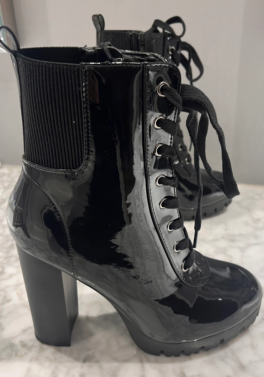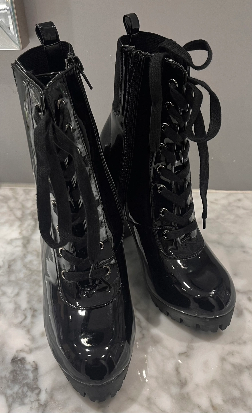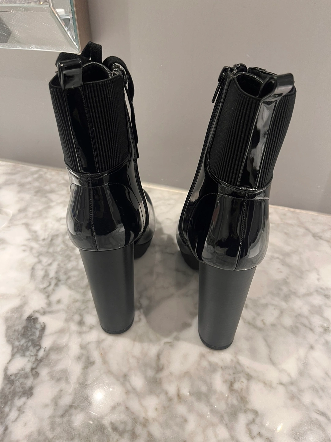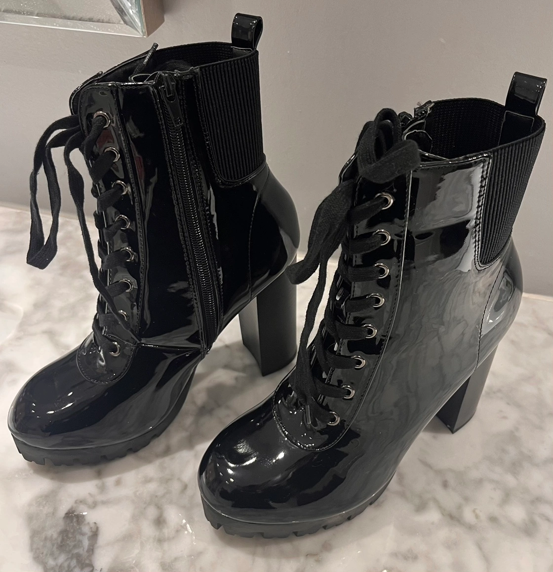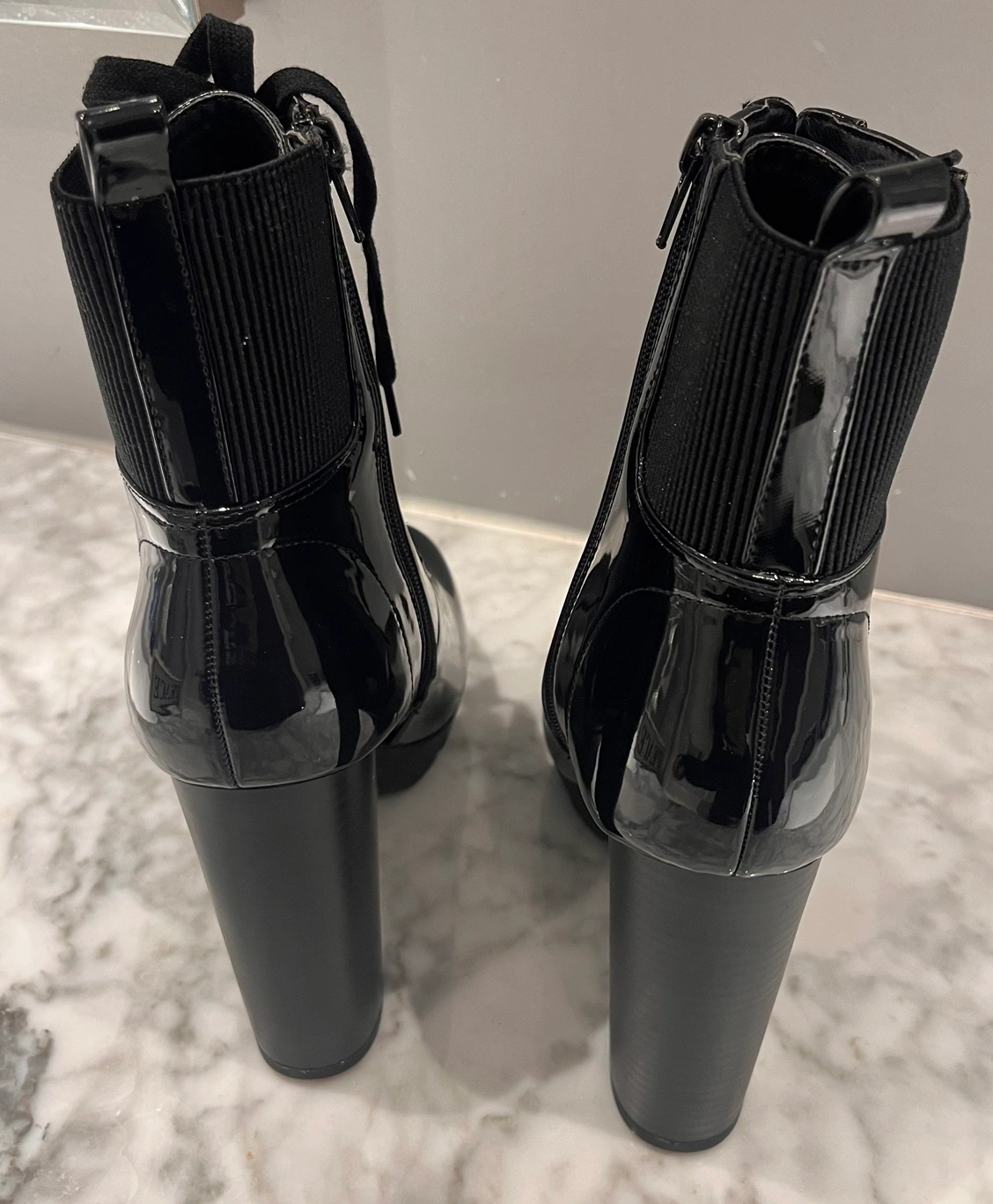 This particular style is out of stock, but to get a better idea you can search up something similar (No strings attached Booties - Black Patent on fashion nova). The only difference between the heels is the padding on the back of the heels when referring to the photos above.