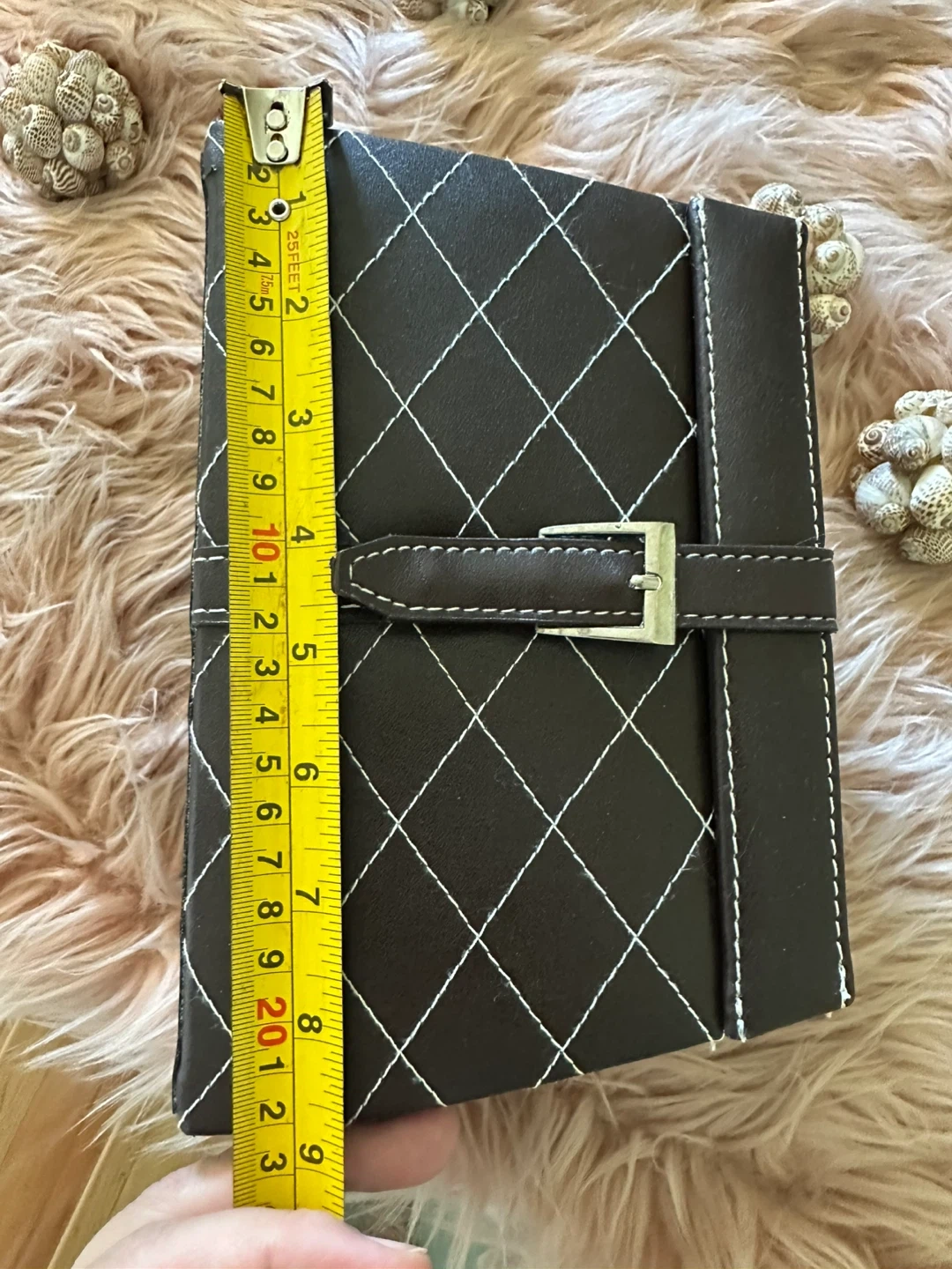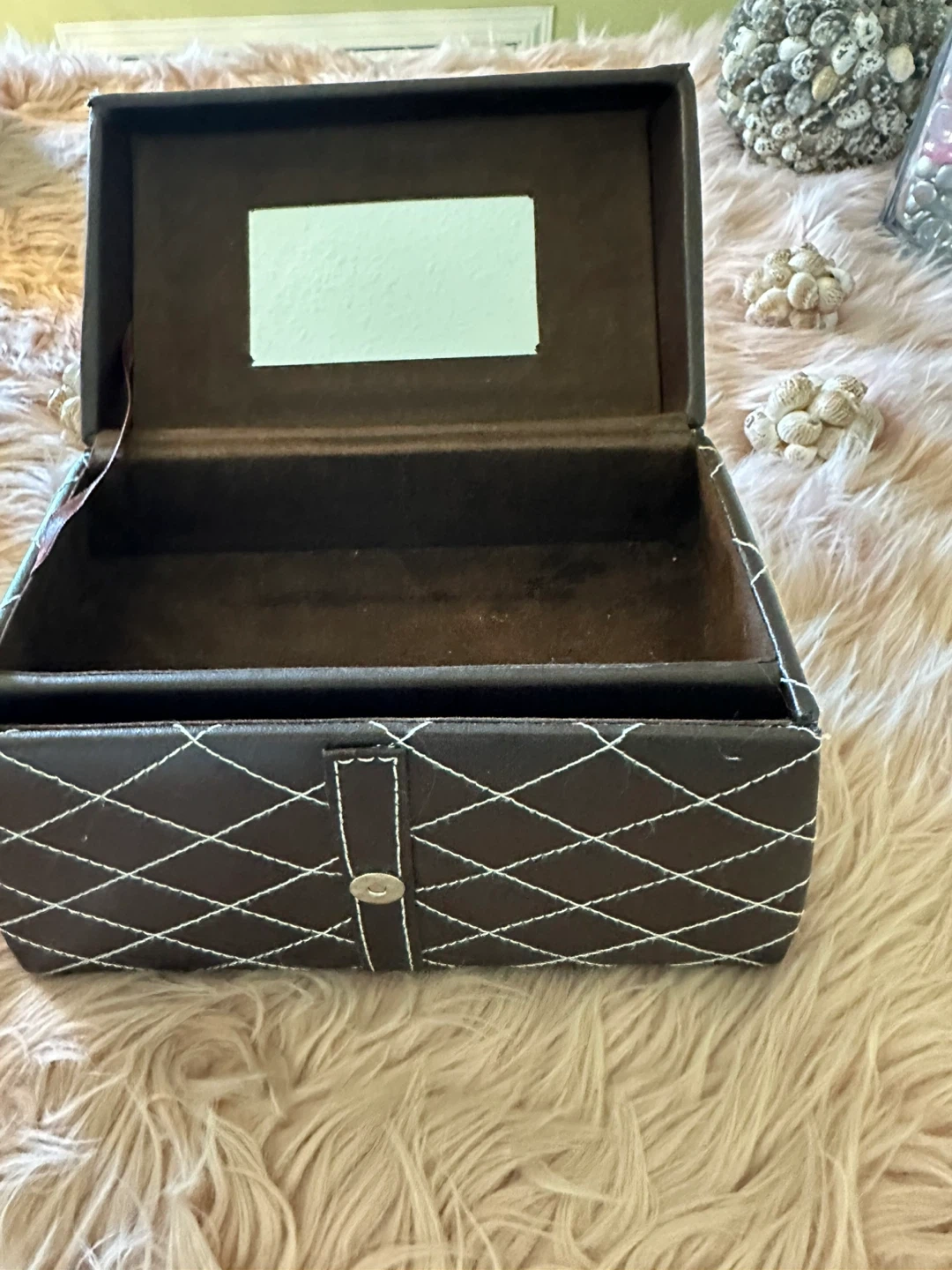 Brown faux-leather quilted jewelry/trinket box with white contrast stitching and silver-tone hardware. Compact size approximately 6 in (15 cm) wide, 4 in (10 cm) deep, and 6 in (15 cm) tall with handle. Secure buckle-style front strap and sturdy top handle make it easy to carry. Inside features a mirror in the lid and three pull-out, felt-lined tiers for organizing rings, earrings, bracelets, or other small items. Gently used condition with minor wear on the exterior edges but fully functional and clean inside, perfect for travel or dresser-top storage.
