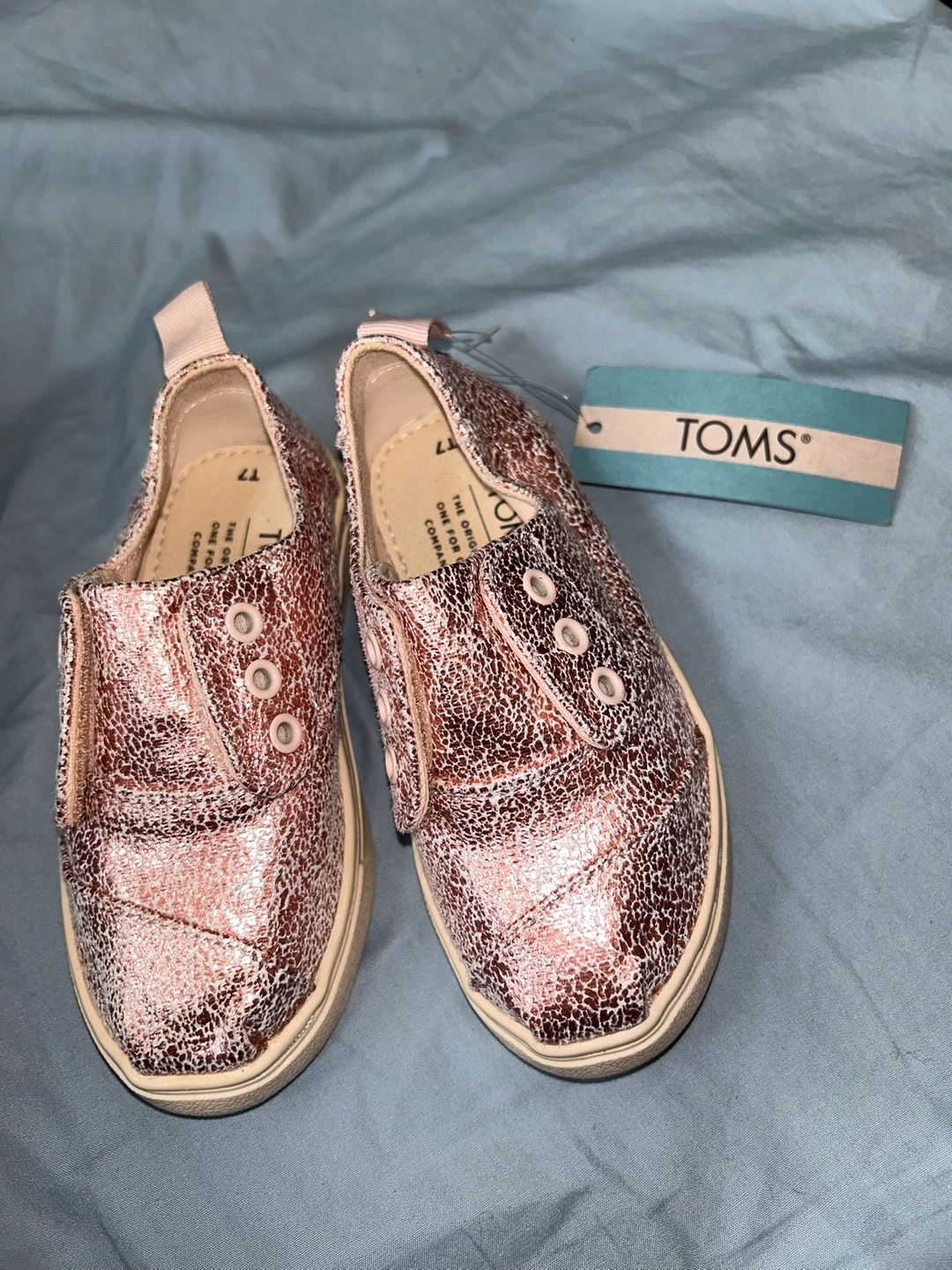 Toms cute little girl sparkly pink slip-on sneakers. Size 7T. Still have tags. Tiny bit of dirt on the bottom from wearing in the house. But otherwise perfect like new condition.