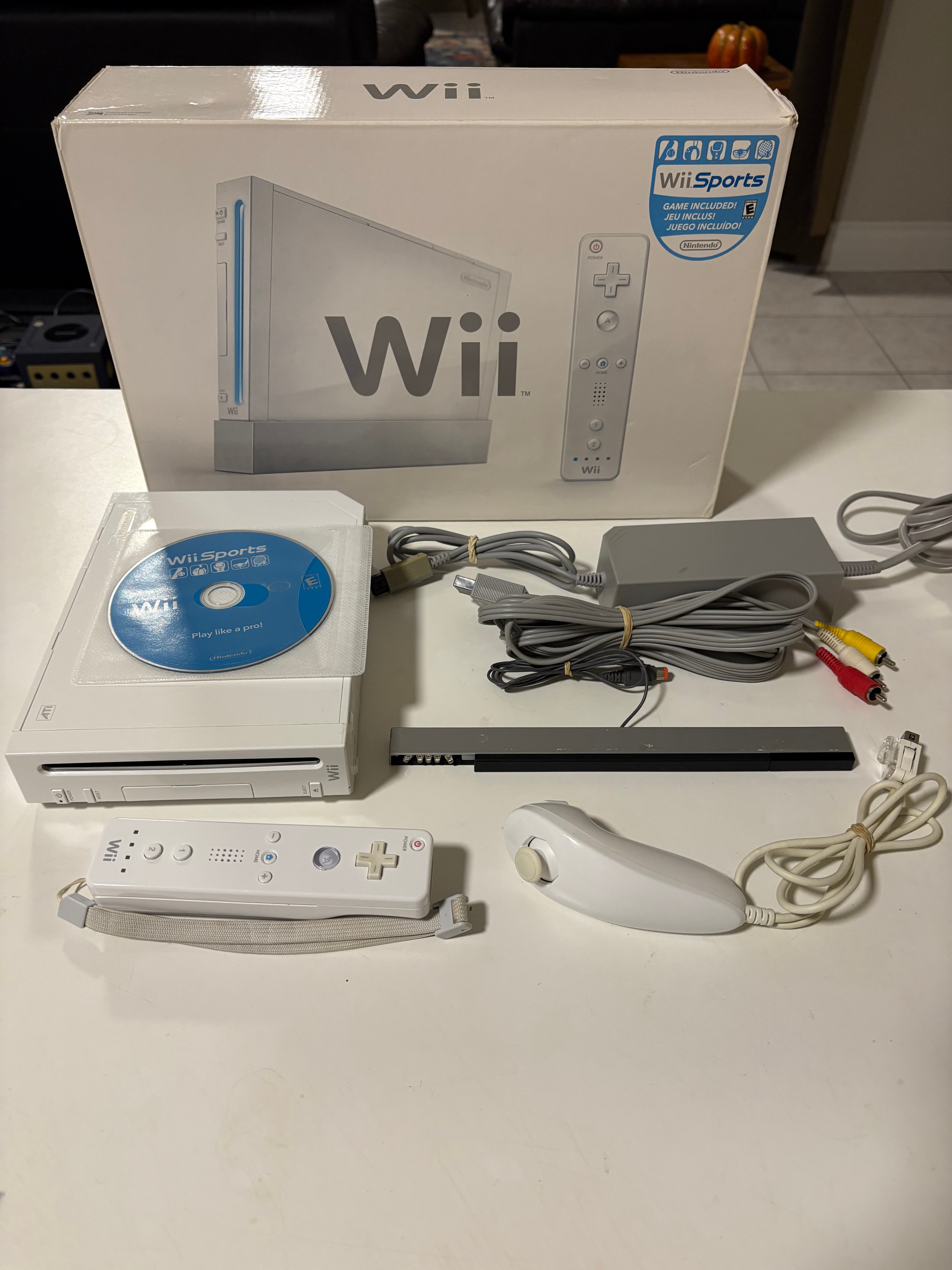 Nintendo Wii w/ power cord, AV cord, and sensor bar. Comes with original box in 5/10 condition. Box has no inserts or manuals. Also comes with a Wii remote, nunchuk, and a Wii Sports disk. Tested and working. Check out my other ads. Open to trades.
