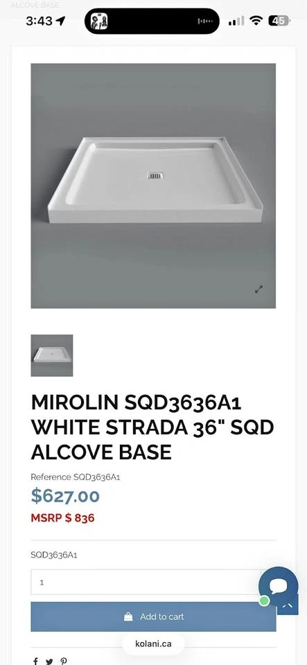Buy & SellMirolin 36x36" Acrylic Shower BaseMirolin 36x36" Acrylic Shower Base$400Brand new Mirolin 36x36" acrylic shower base, still in the box. Feel free to message if you have any questions!WHERE TO MEETCheck LocationView MapSELLERJustinHarrow100 reviews0 chats·0 favorites·1 viewsSEND CHAT TO SELLERHi Justin! I’m interested in your listing.Hi Justin! I’m interested in your listing.Get the Karrot app to chatSign In to chat