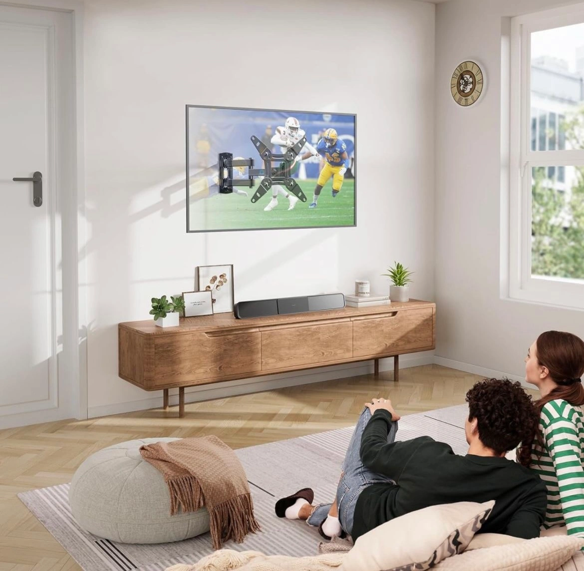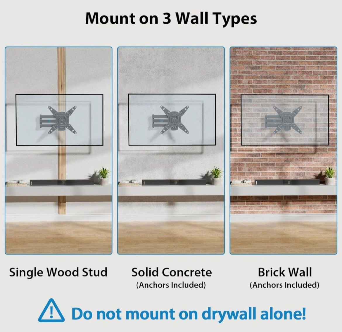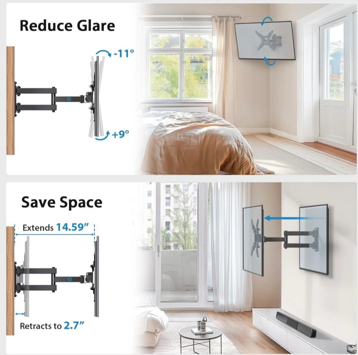 Features of tv mount: The myriad of angles (rotation 360°, tilt up 9° and tilt down 11°, swivel left to right 90°) can help your screen adapt to different situations: sitting, standing, working, laying down, avoiding unsightly sun glare, keeping your screen secure, and reducing neck or back strain.