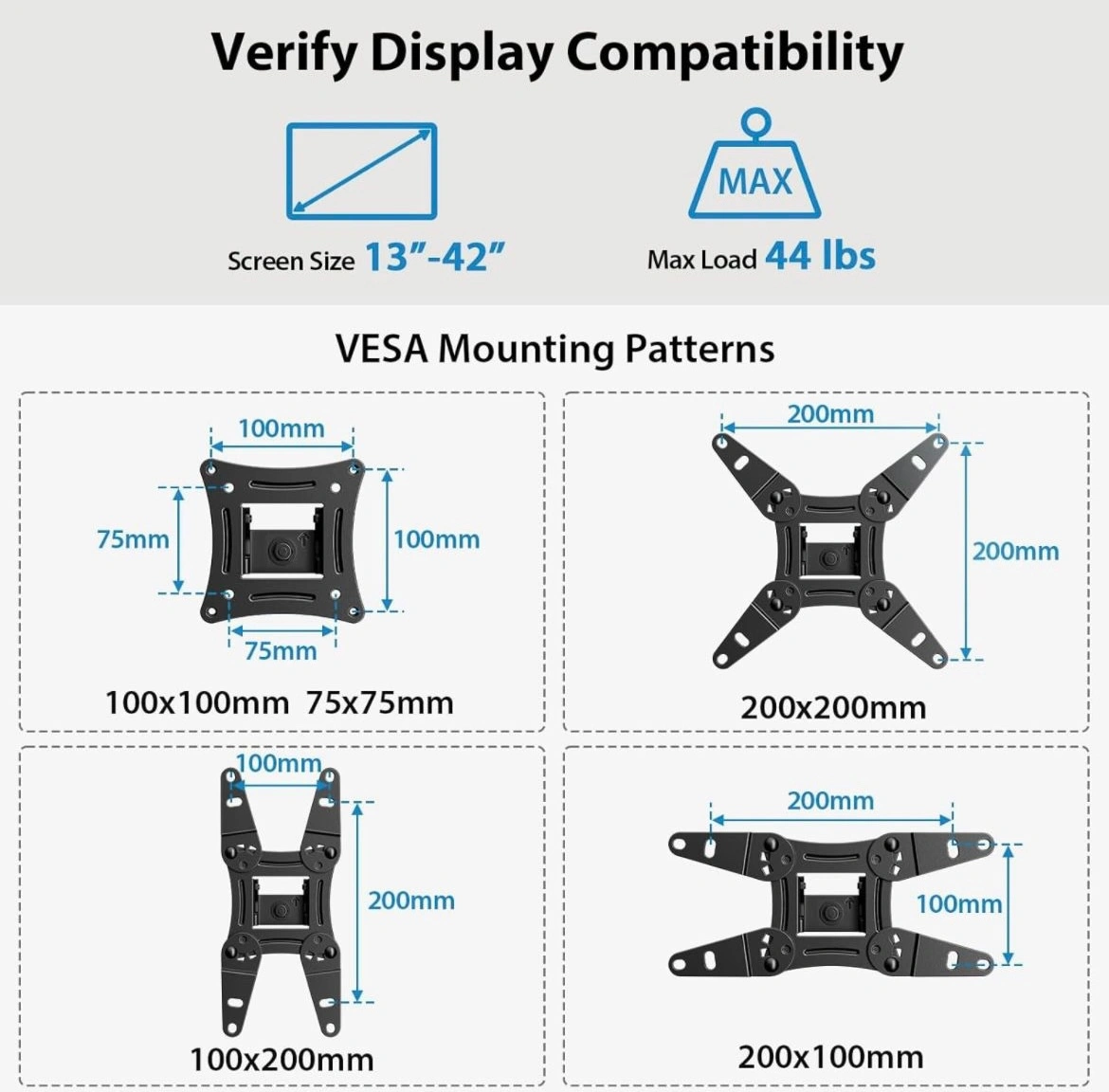 TV Size: Fits 13" to 42" flat panel TVs/monitors and supports TV/monitors weight up to 44lbs/20kg.