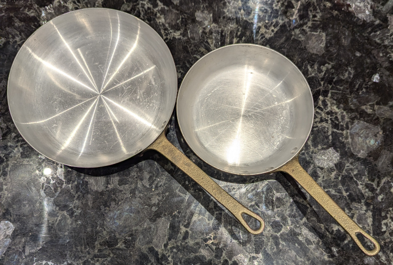 Beautiful vintage copper frying pan set, stainless steel lined with hand forged brass handles. Can be cleaned and functional or used for wall styling. One pan is 8 inches and the other is 6 1/4 inches. Located in Oshawa. Serious inquiries only please.