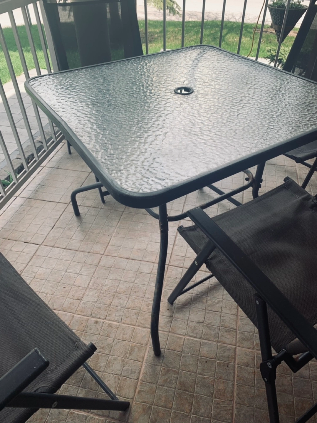 26Table size 33 1/2 in square with whole for umbrella Chairs can be closed