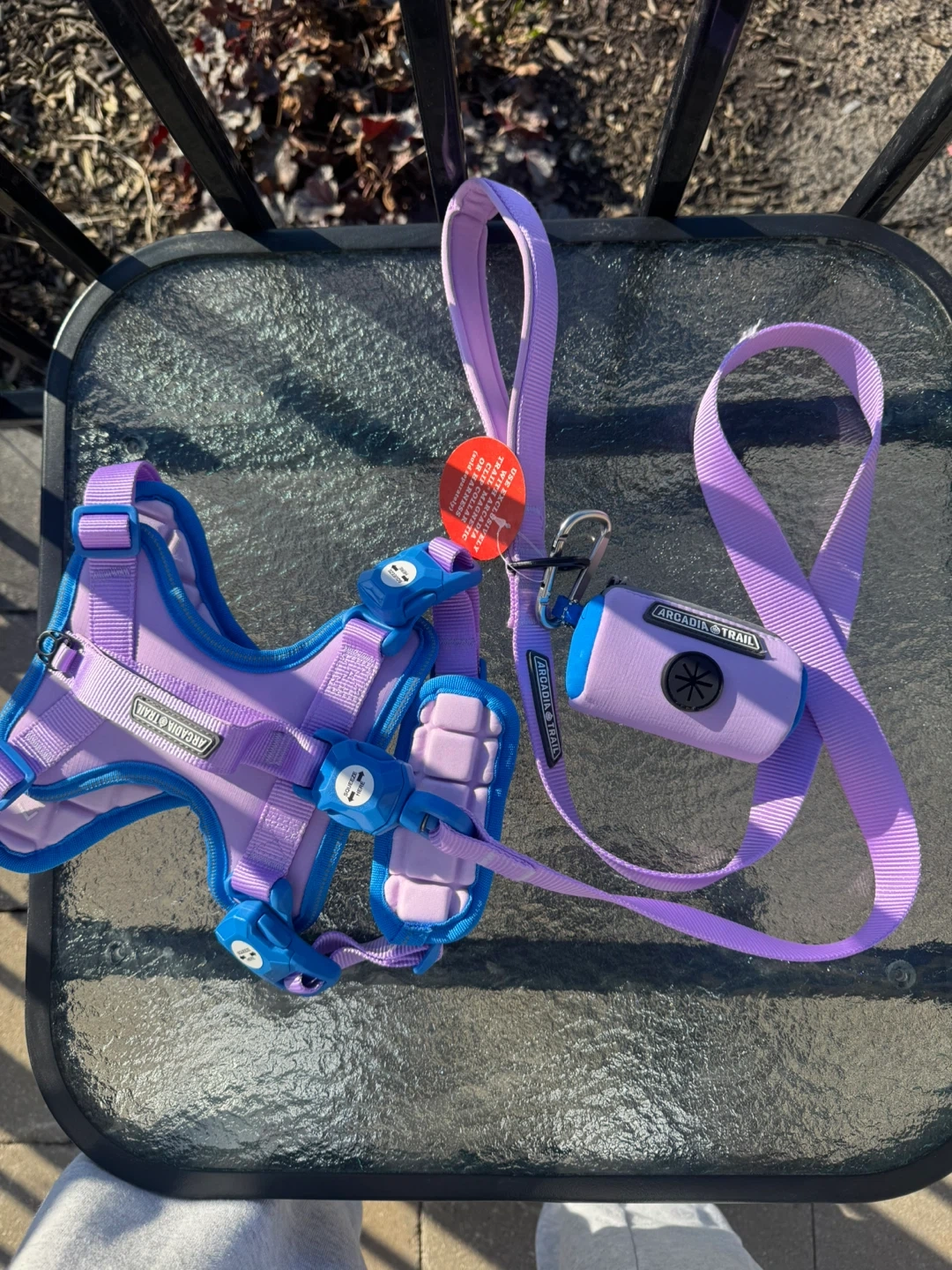 Arcadia Trail dog set includes a lavender and blue adjustable harness, a matching leash, and a waste bag dispenser with a roll of bags. This durable set is perfect for walks and outdoor adventures.