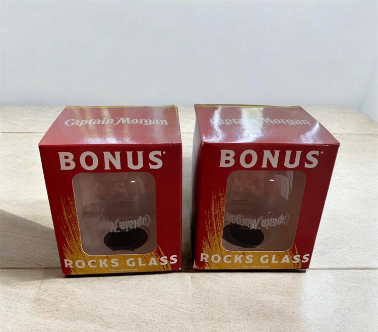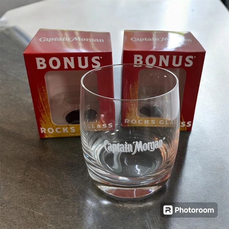 NWT - in the box. Set of 2 Captain Morgan bonus rocks glass. Has the Captain Morgan logo etched on the front. The glass itself is quite heavy and sturdy.