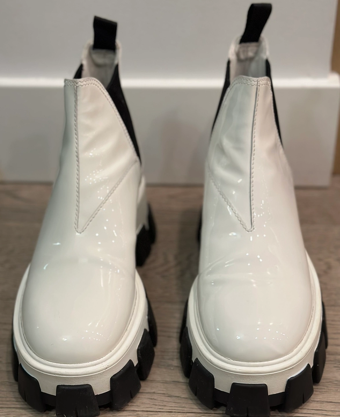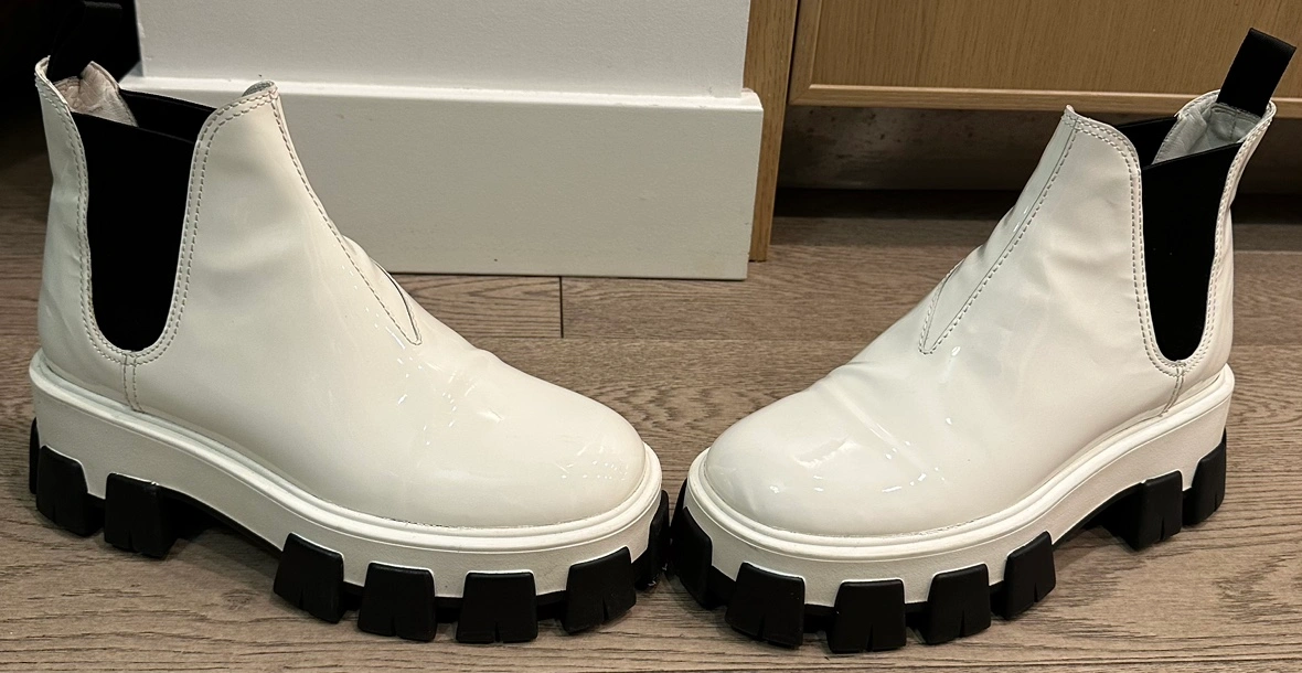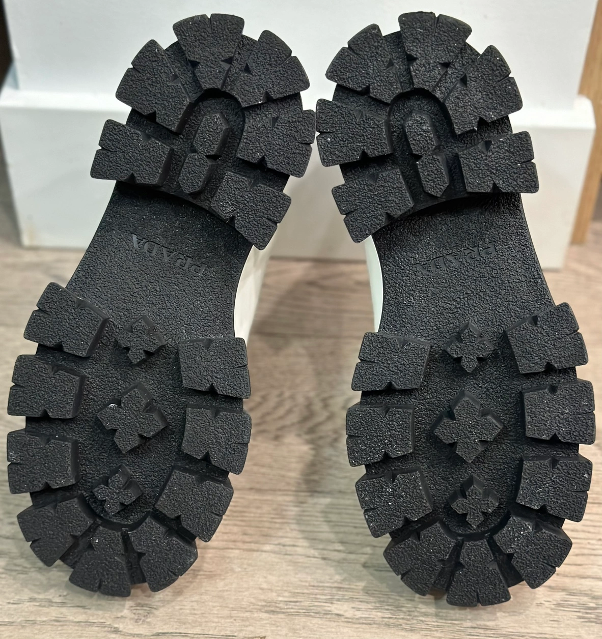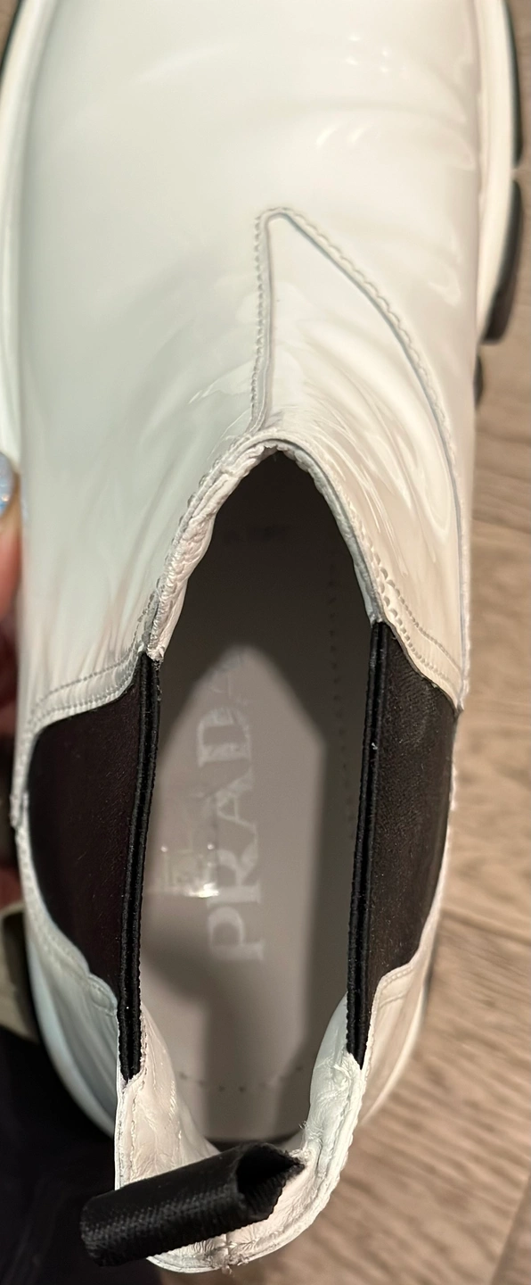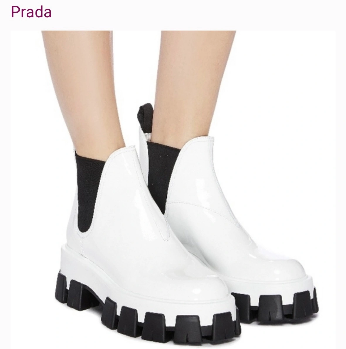84Prada Chelsea Monolith White Patent Platform Lugged Boot Prada Authentic PREOWNED/USED Purchased from Turnabout luxury Consignment