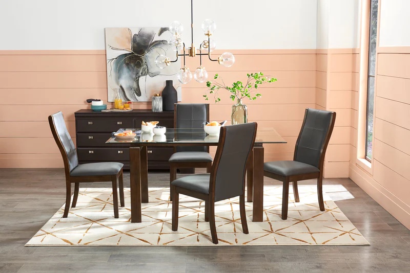 - **Four Stylish Chairs**: Comfortable and sturdy, with cushioned seats and a contemporary design.