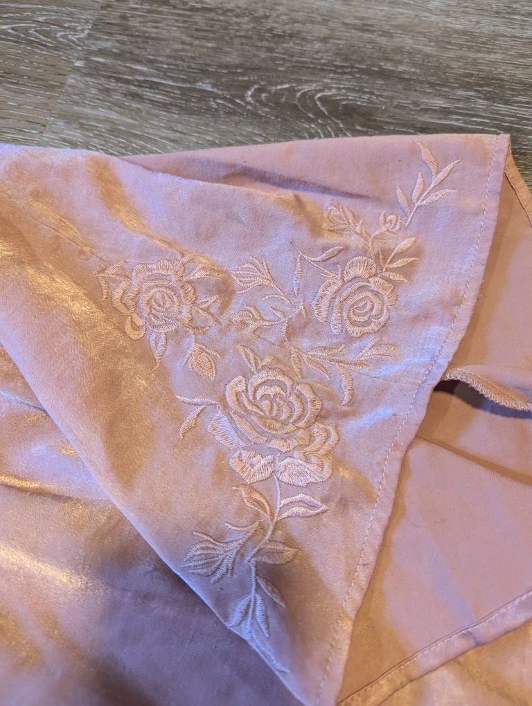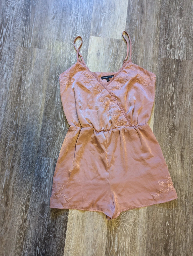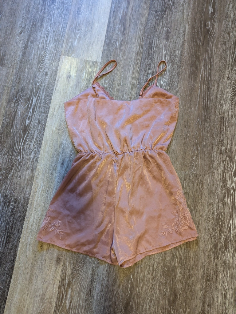 Super cute romper, satiny feel. Embroidered flowers on sides, one piece with clip button on front chest.