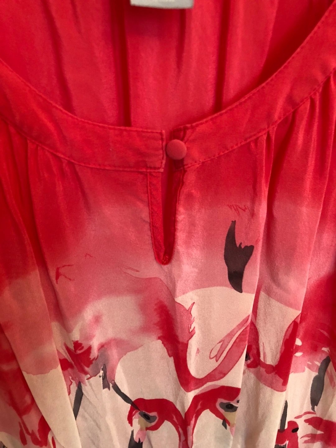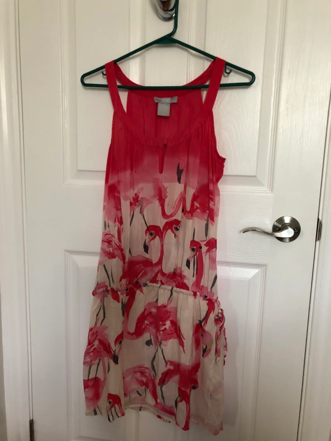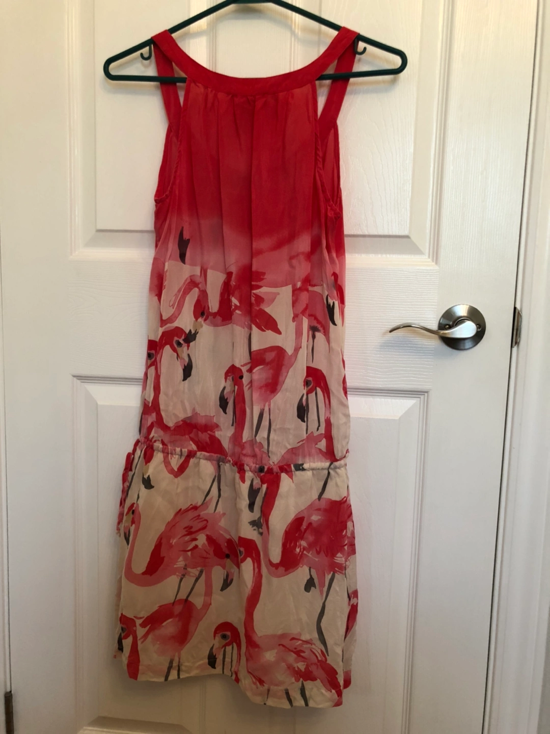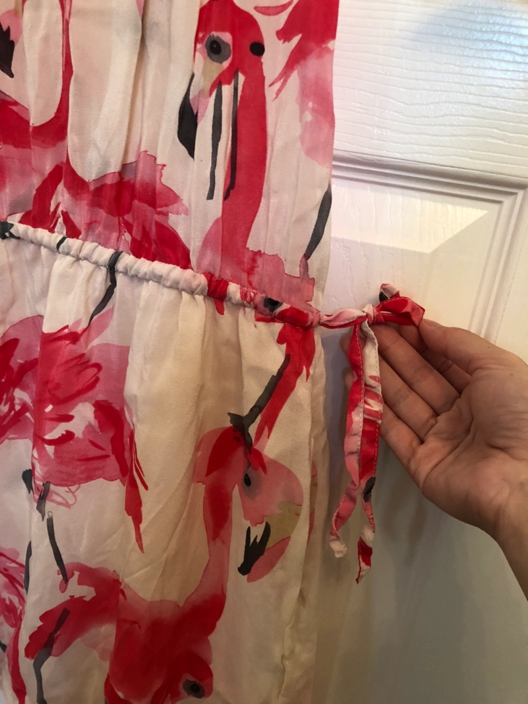 Chiffon dress with halter style straps, drawstring waist detail; falls above knee (on 5’4 person), functional pockets