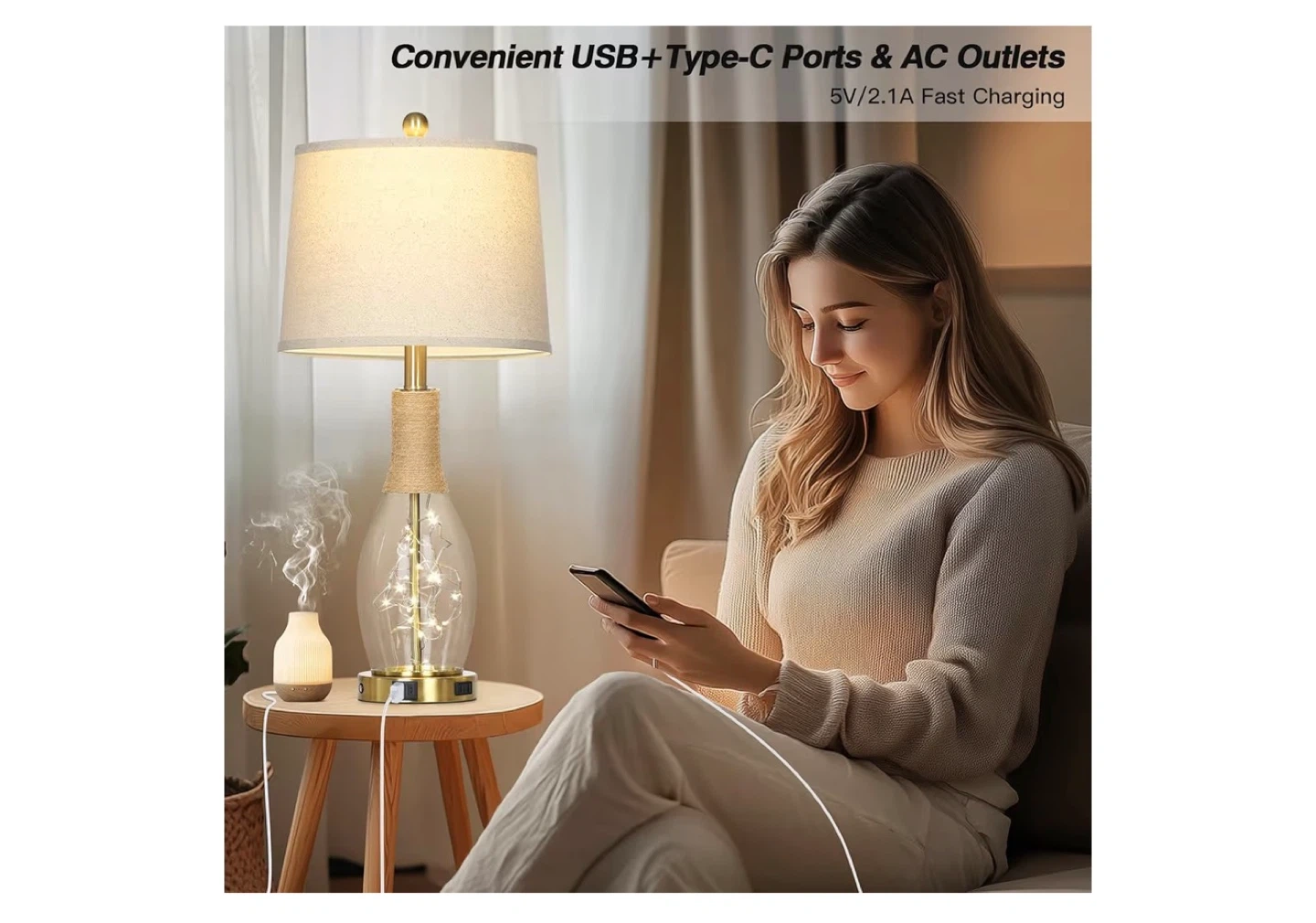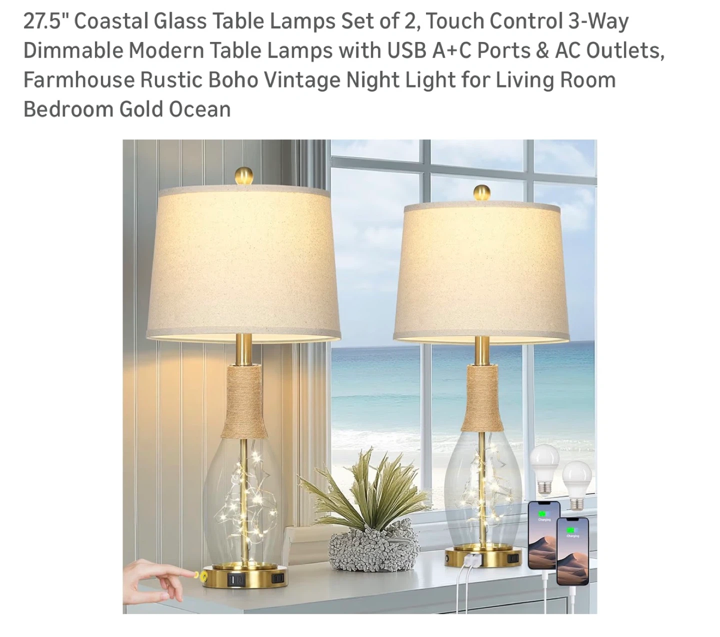 These 27.5" lamps feature a rustic boho vintage design with a linen lampshade. They include built-in USB A+C ports and AC outlets for convenient charging. The lamps have a touch control 3-way dimmable function and a soft night light feature within the glass base.