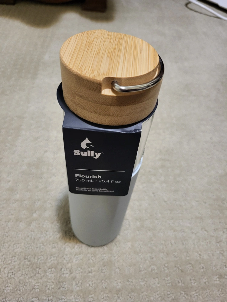 I'm selling a Sully Flourish glass bottle. It holds 750 mL (25.4 fl oz). It has a bamboo lid with a metal handle and a silicone sleeve. It also fits in most cupholders