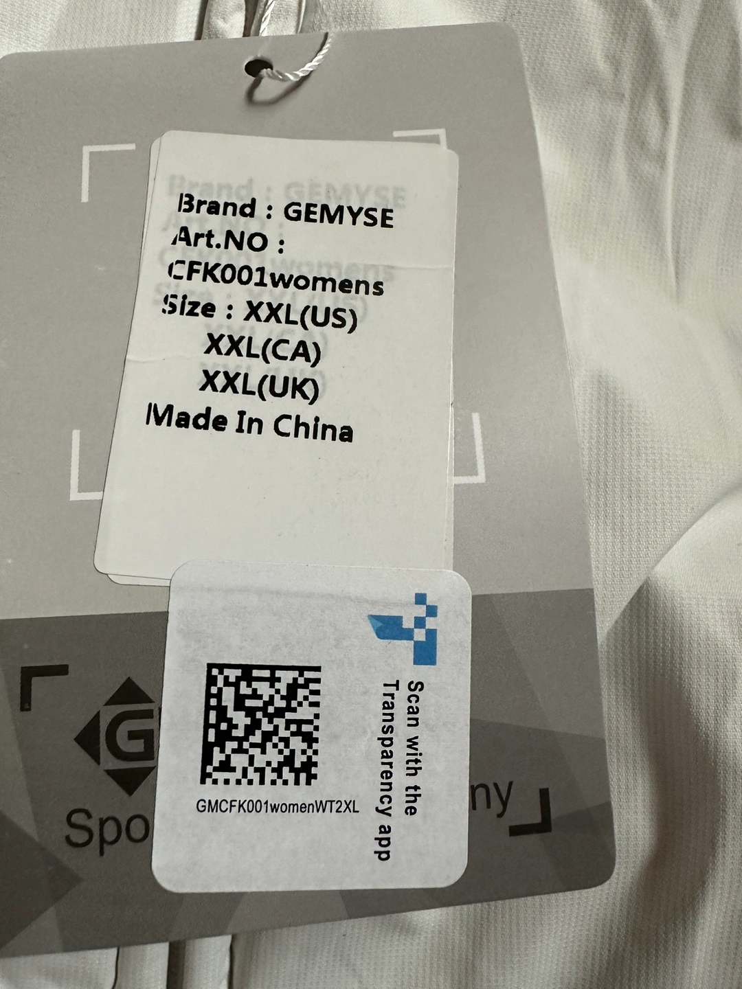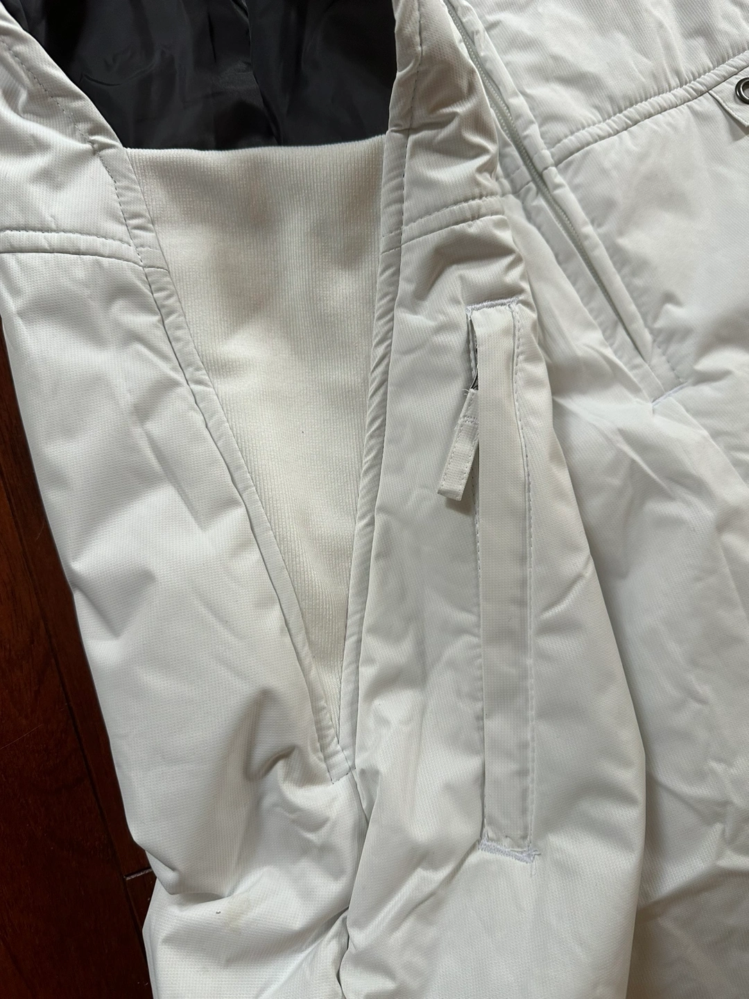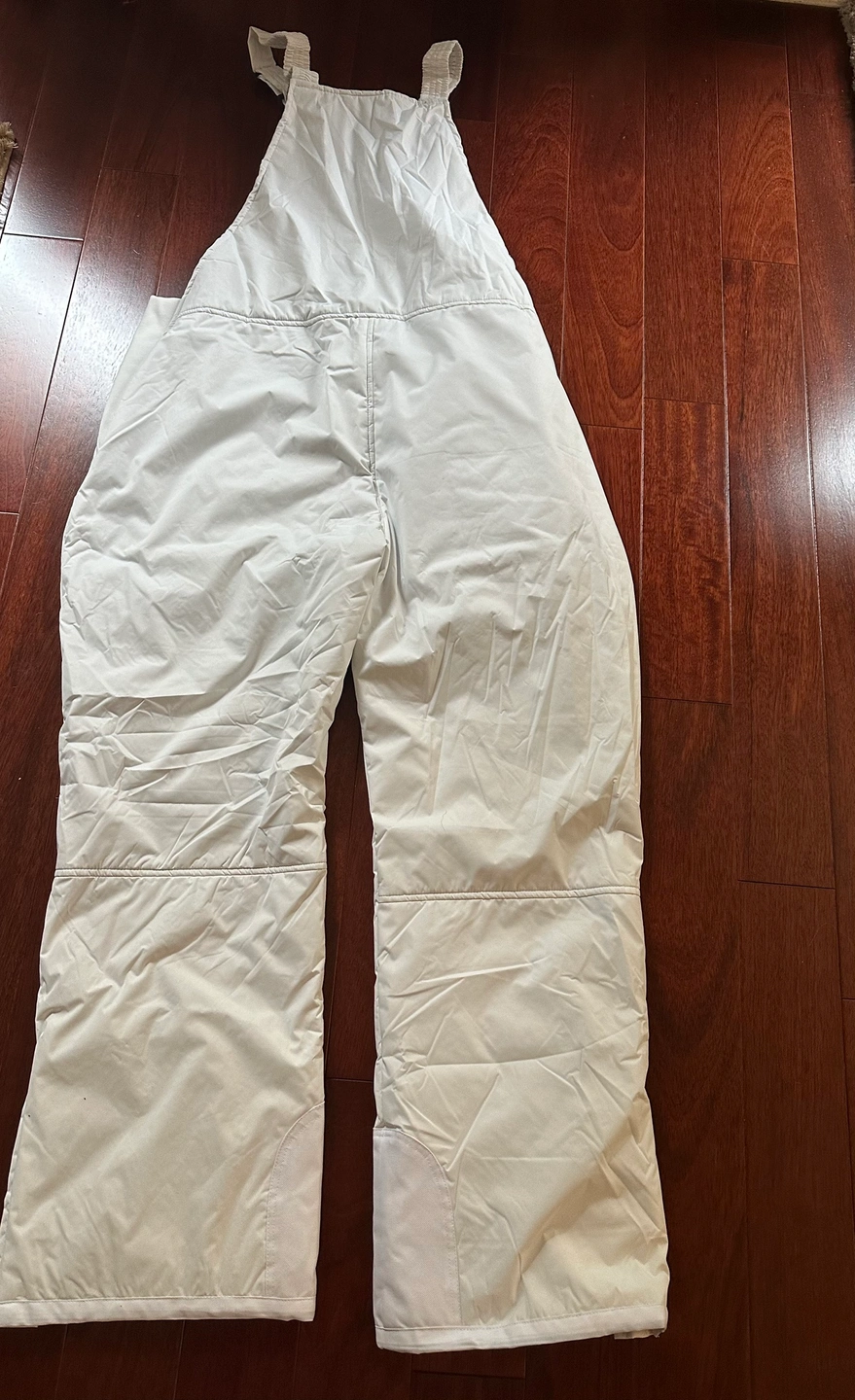 Women size XXL, white colour. Waterproof, breathable, lightweight,windproof, durable & keep warm. Has elastics on the sides, 2 front zipped pockets & adjustable straps.
