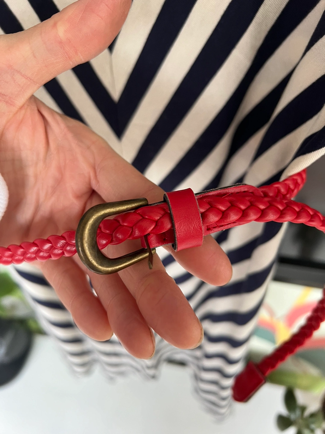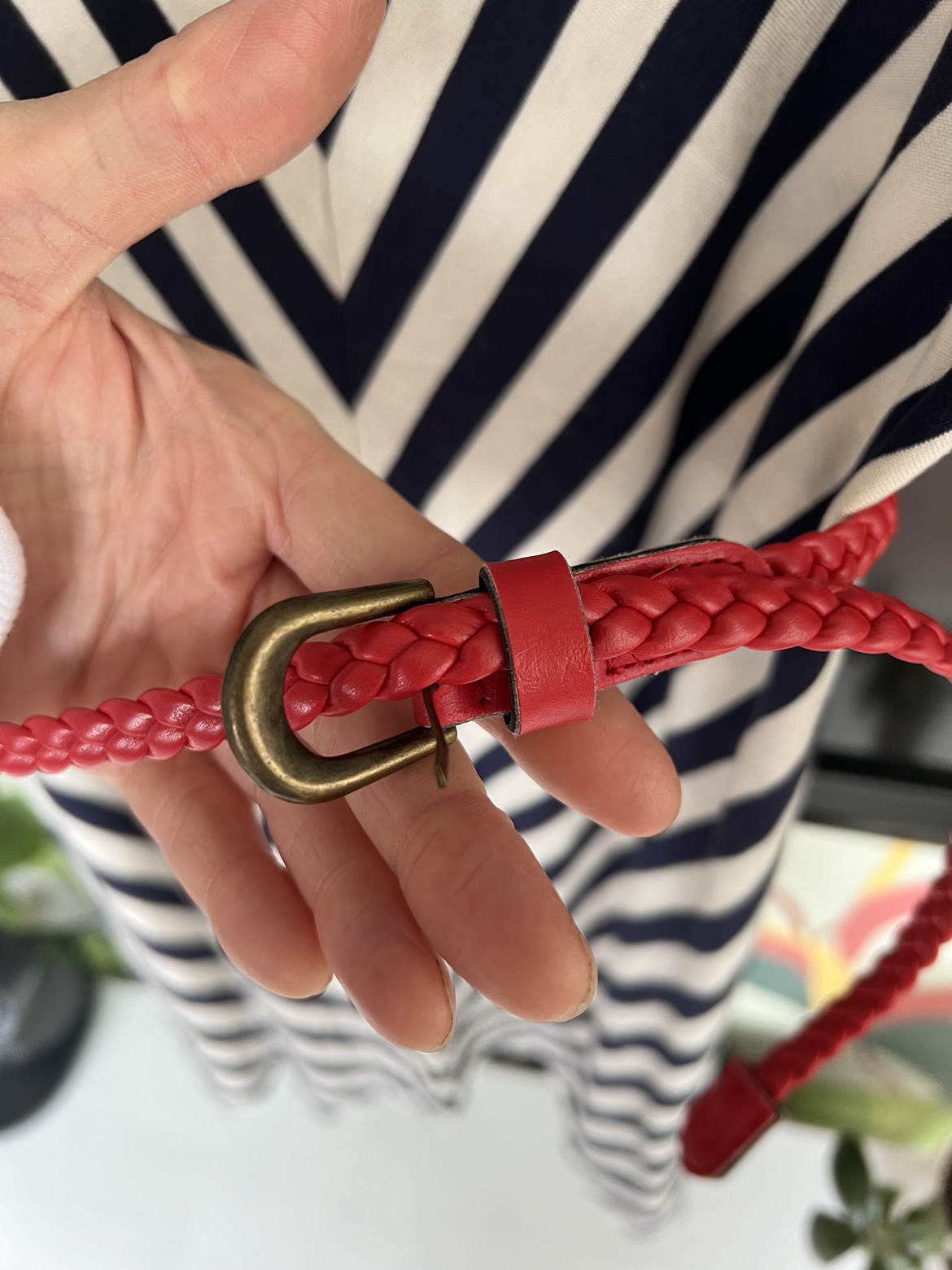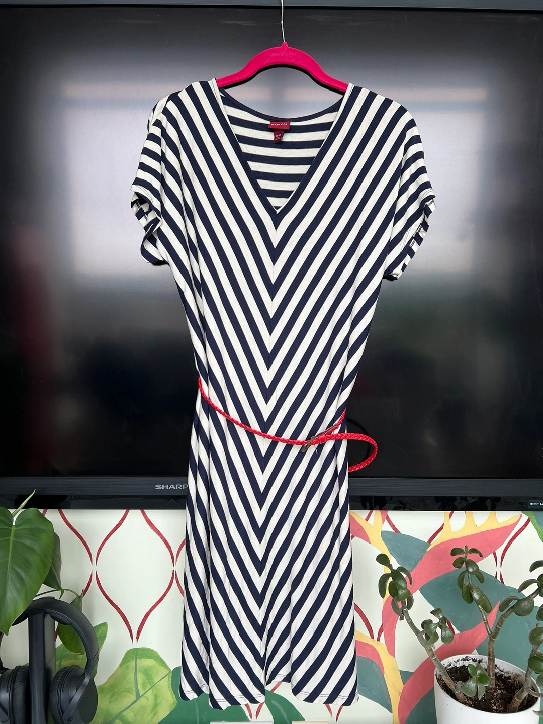 Black and tan striped knit dress with removable orange belt. Chevron/diagonal stripes on front, horizontal on back. Soft comfortable material, short sleeved V-neck. Worn only once.