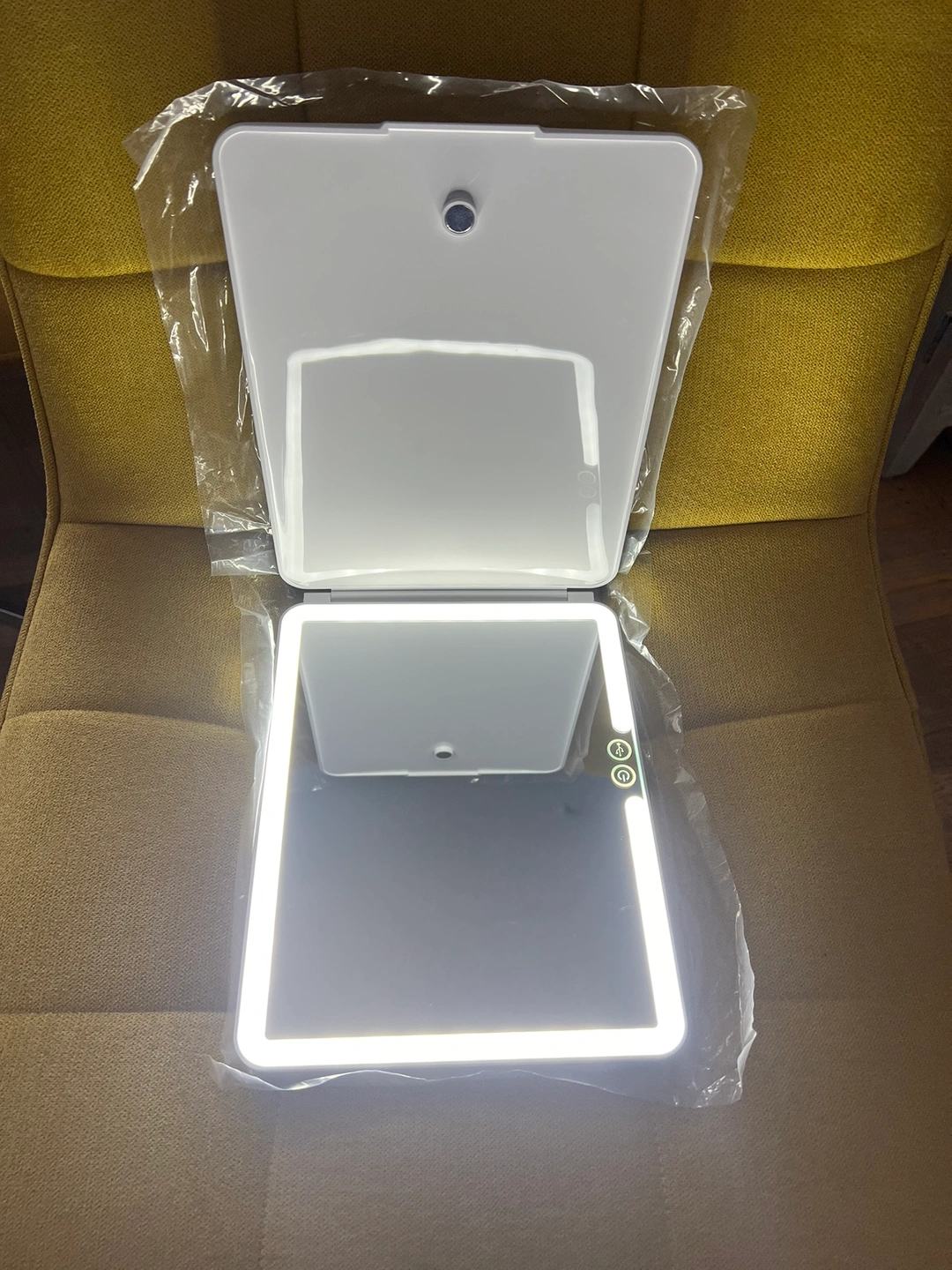 This portable, high-quality glass makeup mirror with all-around LED lighting is perfect to take with you on your travels. The sleek glossy white cover protects your mirror so you can take it with you wherever you need. You'll never have to struggle with dim hotel lighting again! Bonus - the beautiful LED lighting acts as a ring light for the perfect selfie!