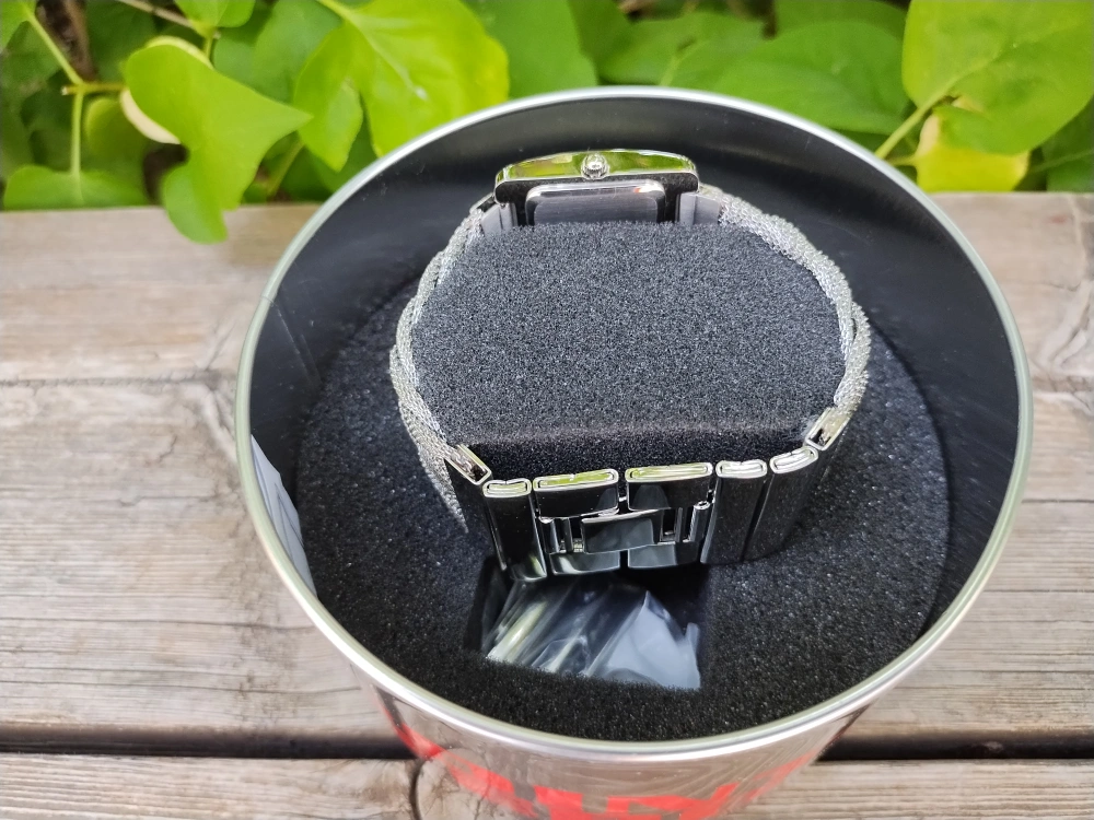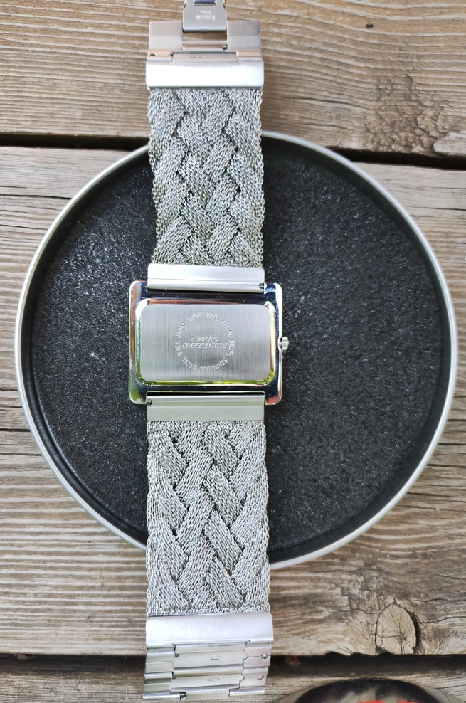 New condition in original tin, extra links, working battery. Face is 1.50 inch width, bracelet is 1.25 width. Sized for a 6.50 inch wrist.