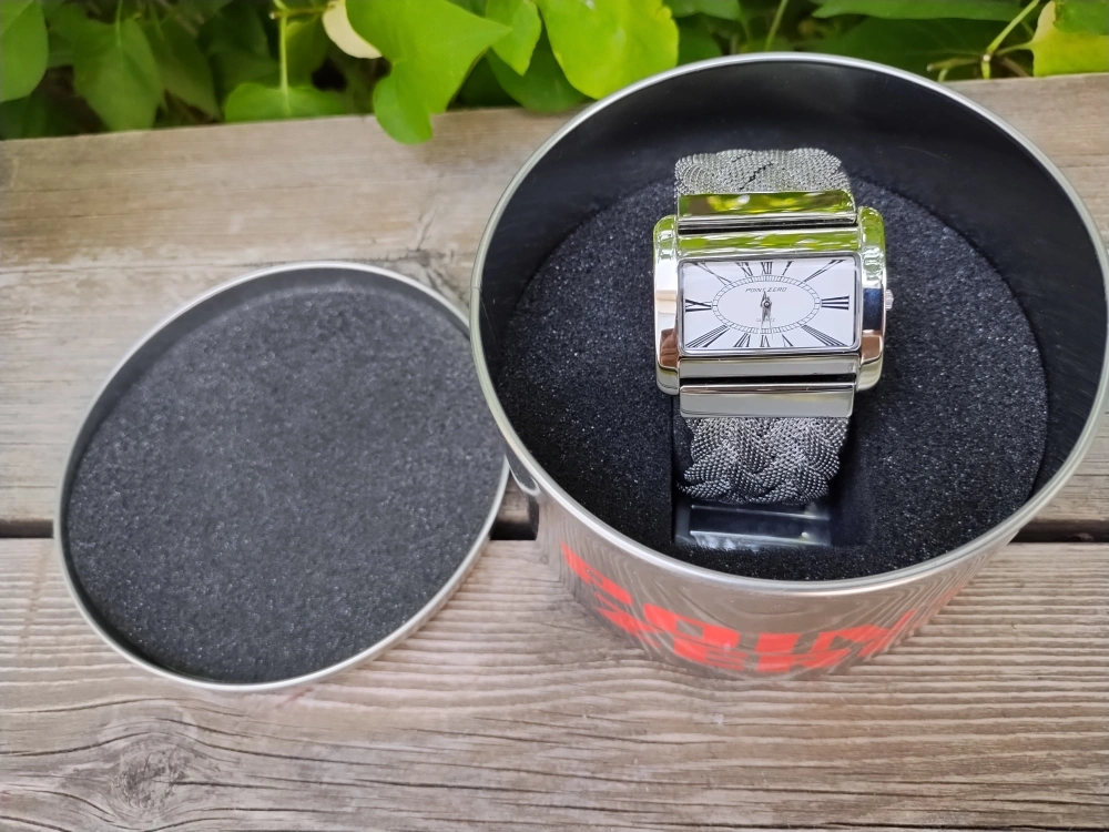 New condition in original tin, extra links, working battery. Face is 1.50 inch width, bracelet is 1.25 width. Sized for a 6.50 inch wrist. Meet in Killarney SW.