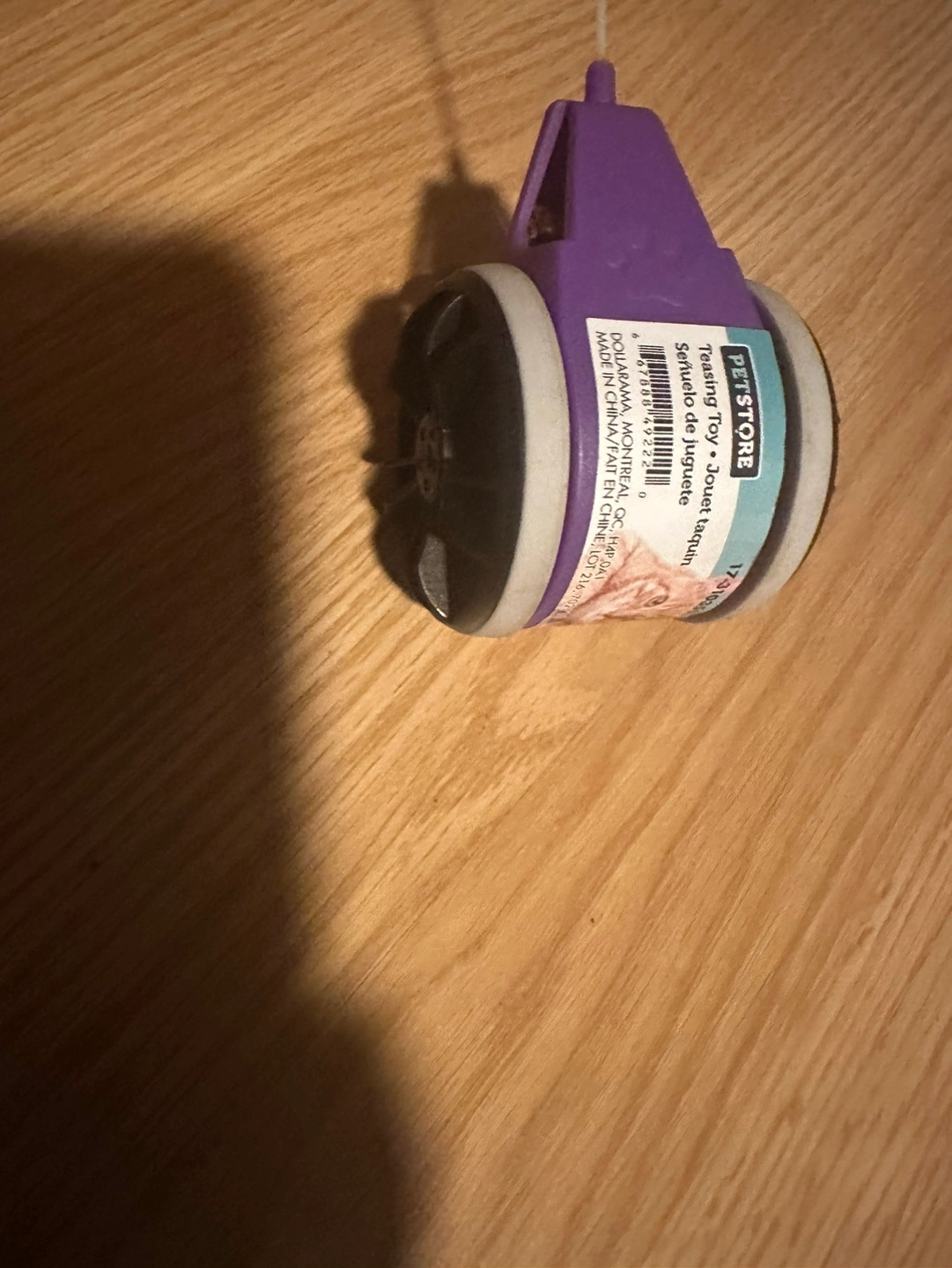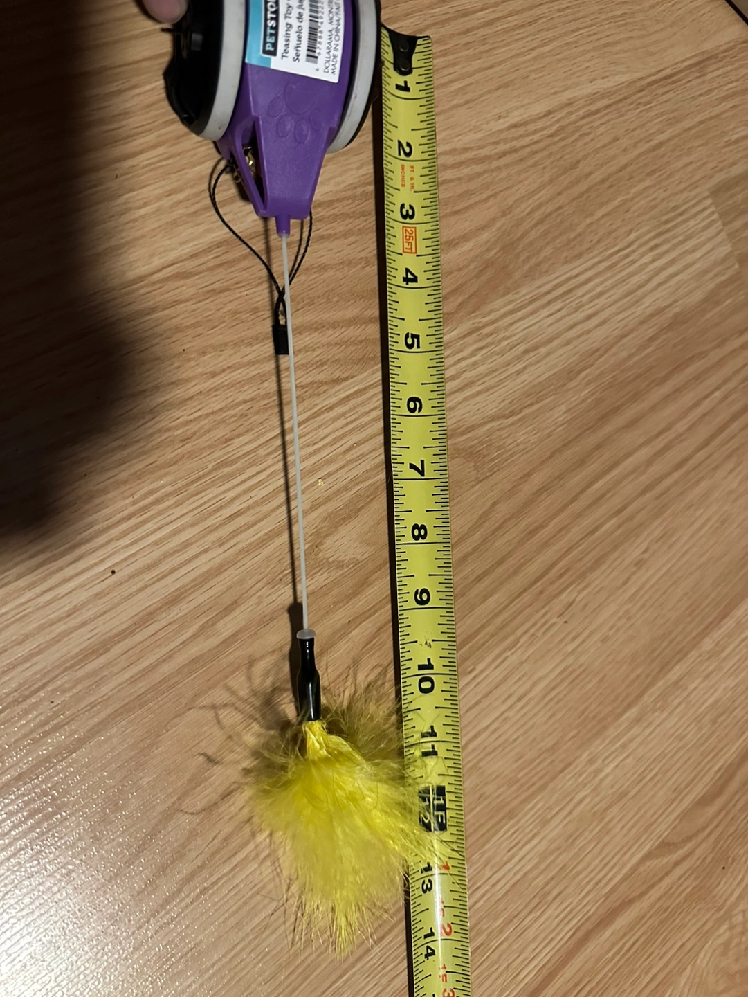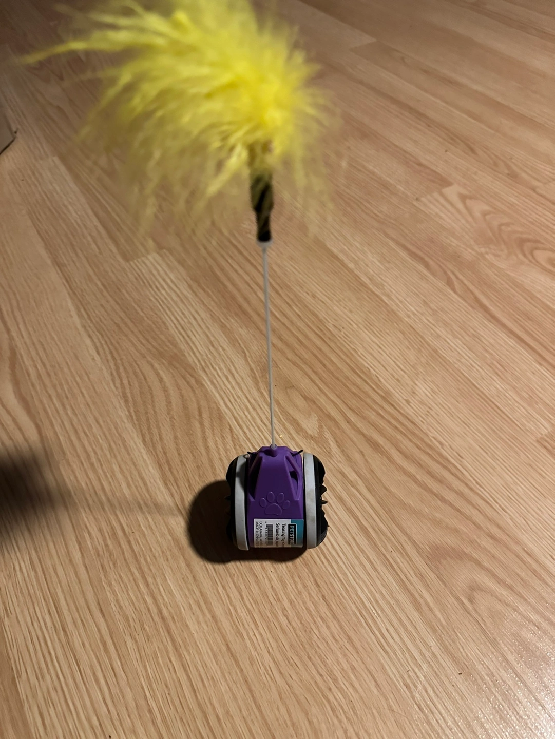 Dollarama cat toy rolls across the floor swaying back and forth with a yellow feather on top. Dollarama sells for $3.