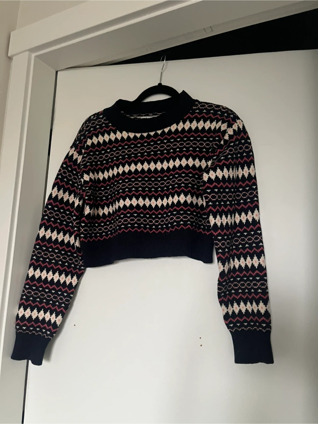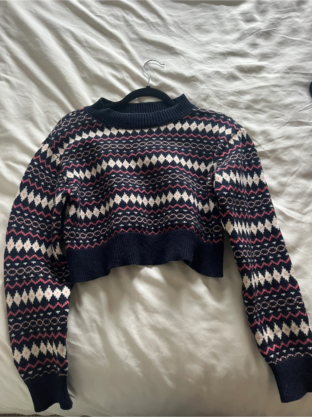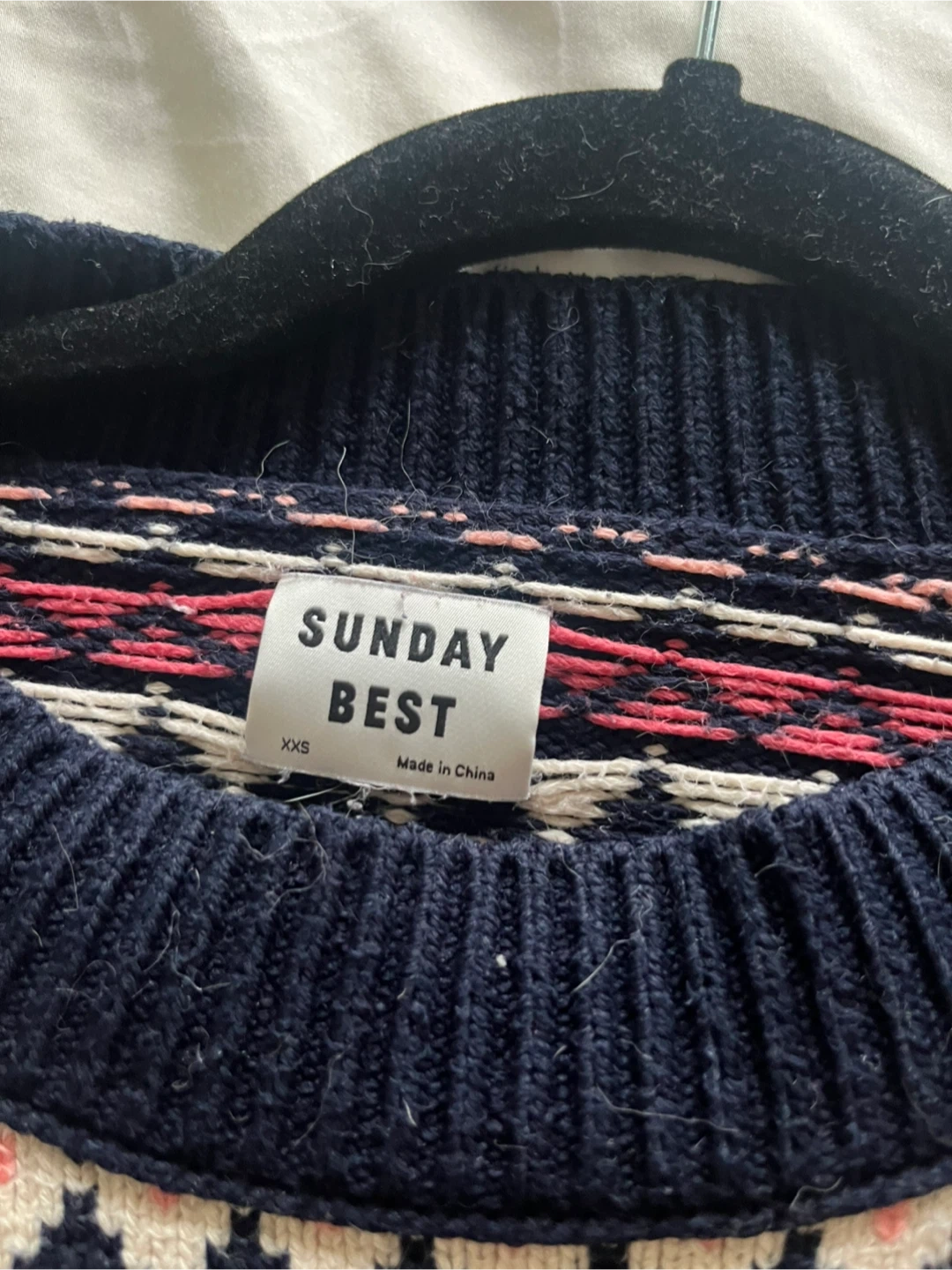 Navy blue cropped sweater from Sunday Best with a classic fair isle pattern in pink and white. It's a size XXS and made in China. This cozy sweater is great for layering during cooler weather!