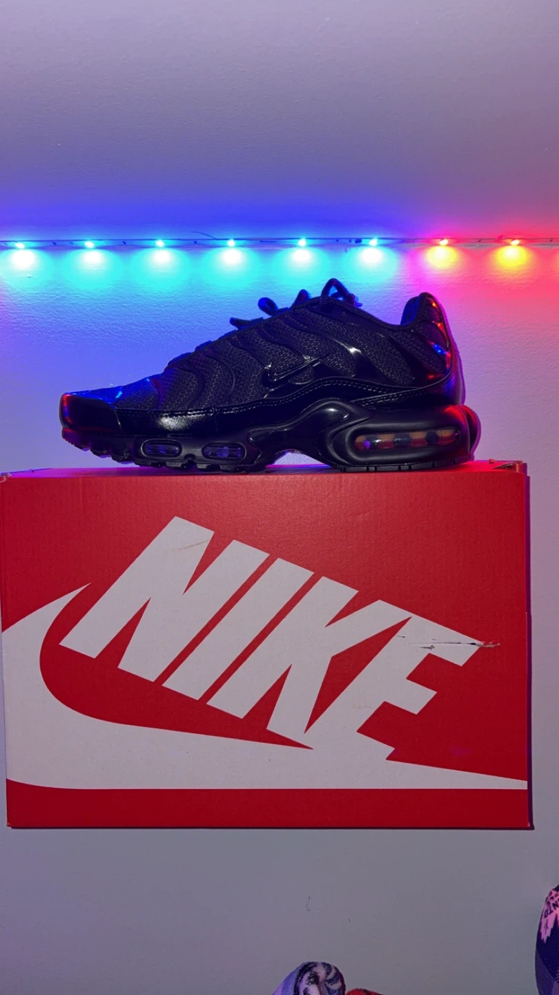 Black Nike Air Max TN Plus sneakers. These shoes feature the iconic Tuned Air cushioning system. They have a sleek, all-black design.