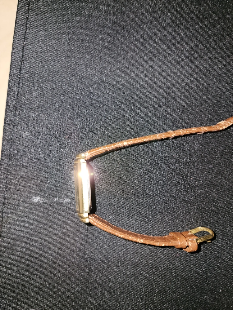 Selling a Lafayette women's watch with a gold-tone case and brown leather strap. The watch has a rectangular face with small decorative stones. The band shows some signs of wear.