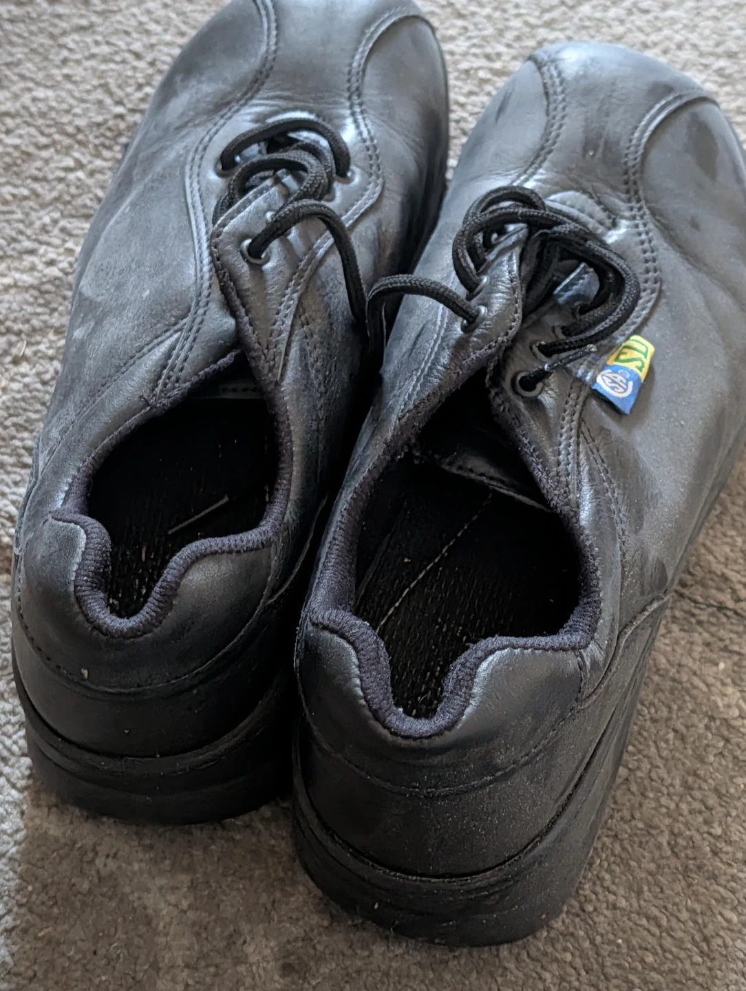 Black leather lace-up shoes. Comfortable and durable for everyday wear. These shoes are great for work or casual outings. They're made with quality materials. Size is not visible.