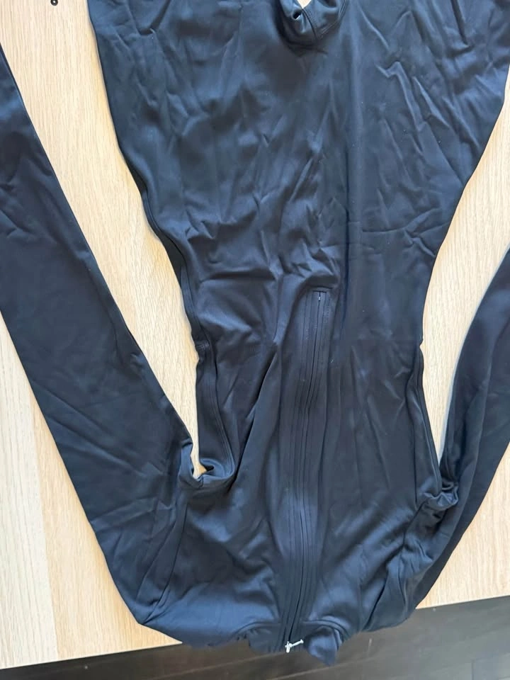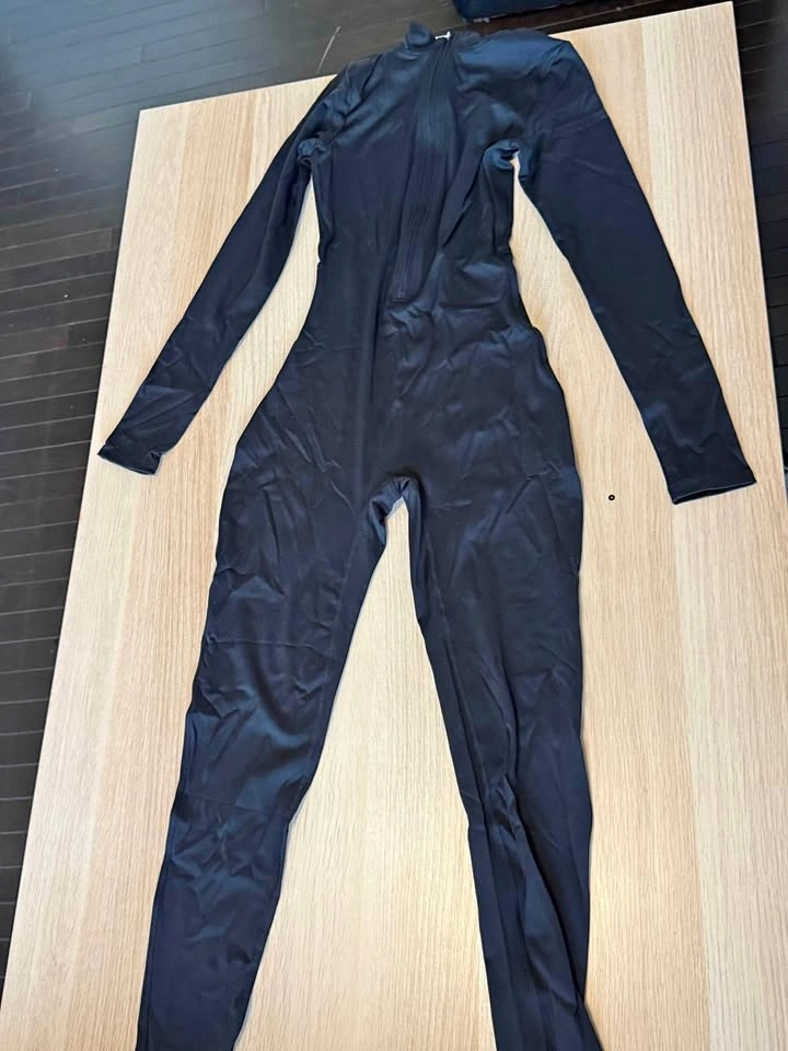 Sleek black long sleeve jumpsuit with a front zipper. The material is stretchy and comfy, great for working out or just lounging.