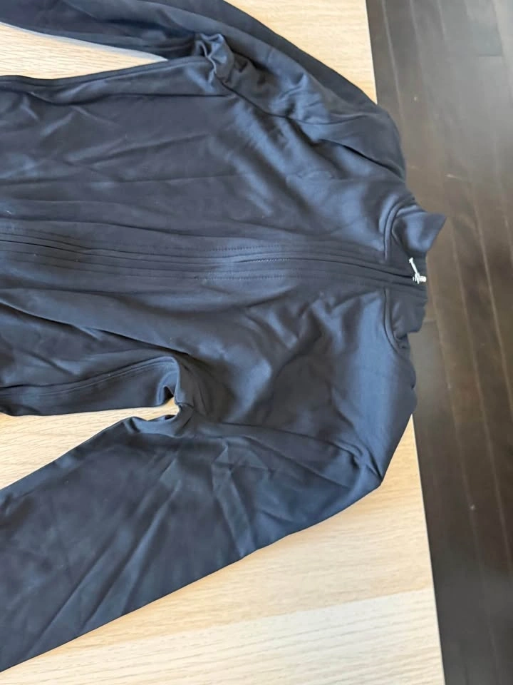 Sleek black long sleeve jumpsuit with a front zipper. The material is stretchy and comfy, great for working out or just lounging.