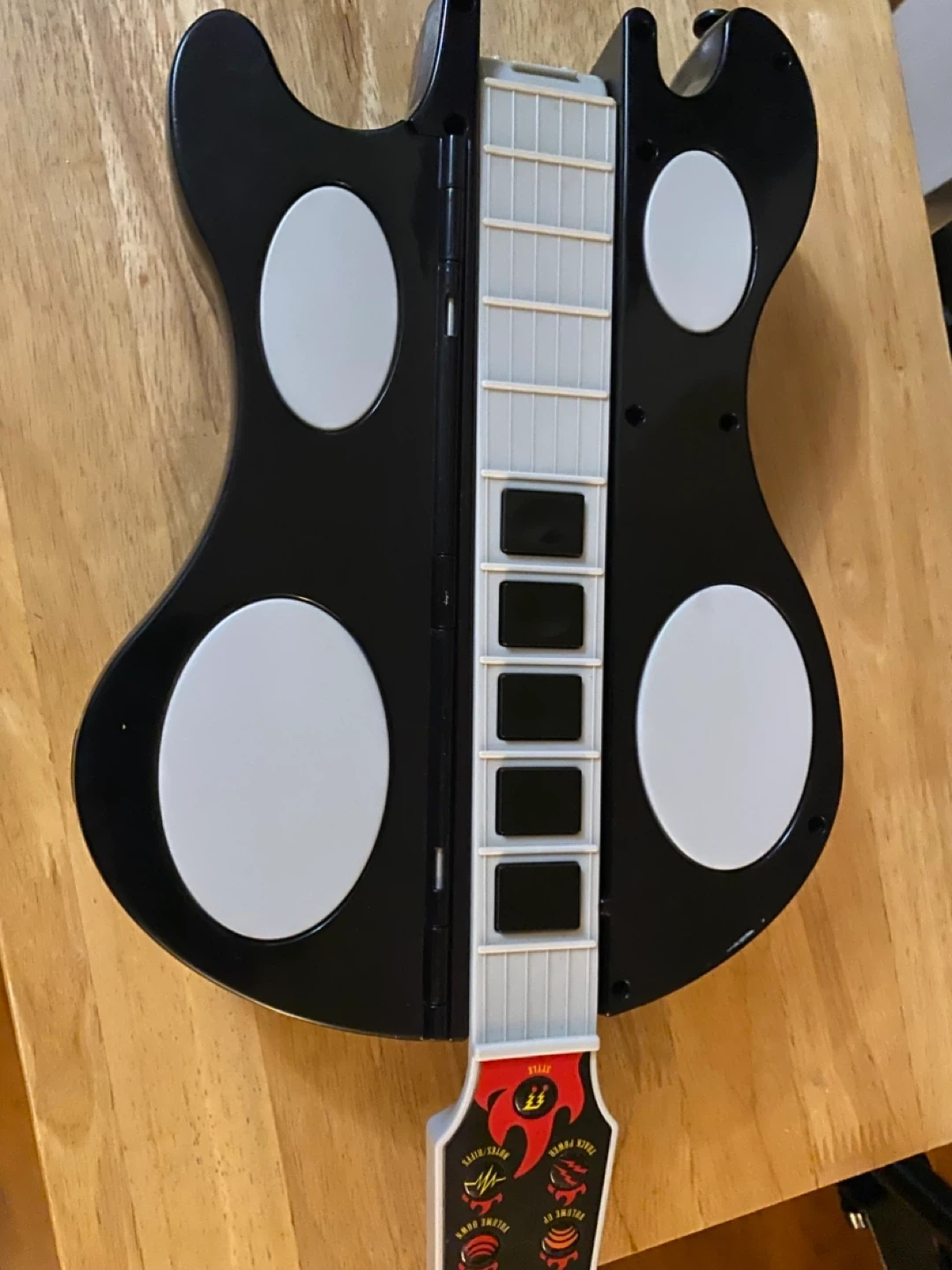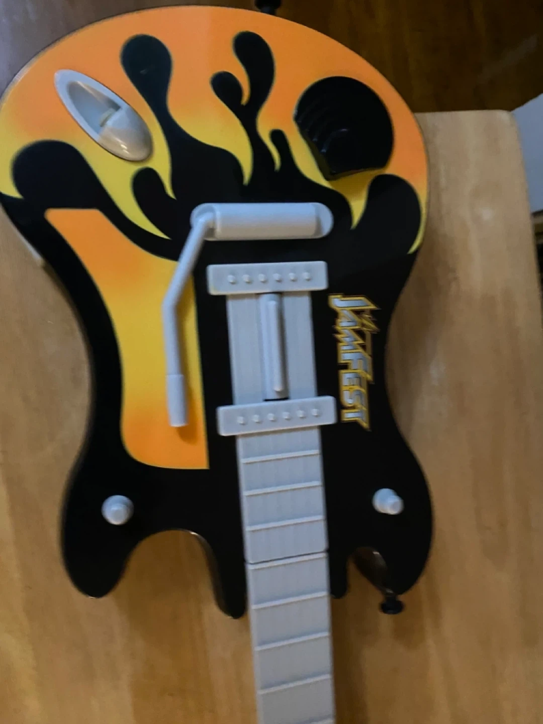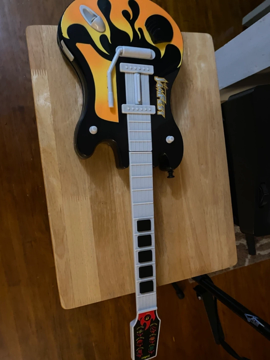 This is a Jamfest brand toy guitar with a built-in keyboard. It features multiple buttons and a strum bar for interactive play. The design is black with orange and yellow flames.