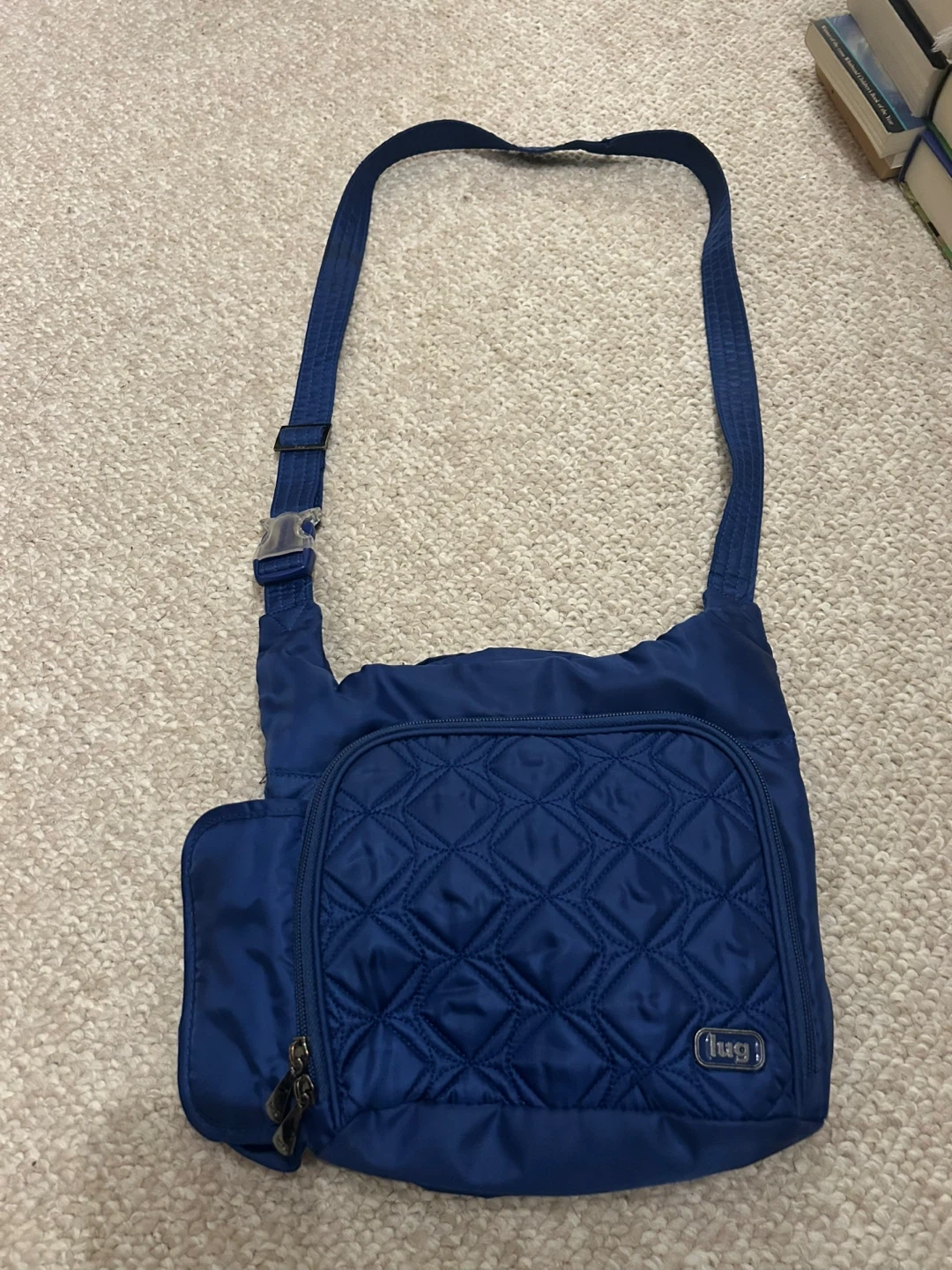 This gently used lightweight, quilted Lug® bag has everything you need to stay stylishly organized on the go--including a side water bottle holder, plenty of pockets, and an RFID-protected main interior to keep your valuables safe. Its clever design converts from a crossbody to a waist pack, making it ideal for festivals, outdoor concerts, and other outings where you might want convenient carrying options. Features: Includes cross-body bag/waist pack Drawbridge zip opening Soft-lined pull-tab magnet pocket on top of back Back zip pocket Hidden side water bottle pocket with magnetic closure Gunmetal hardware RFID-protected main interior with three cargo pockets and two pen holders.