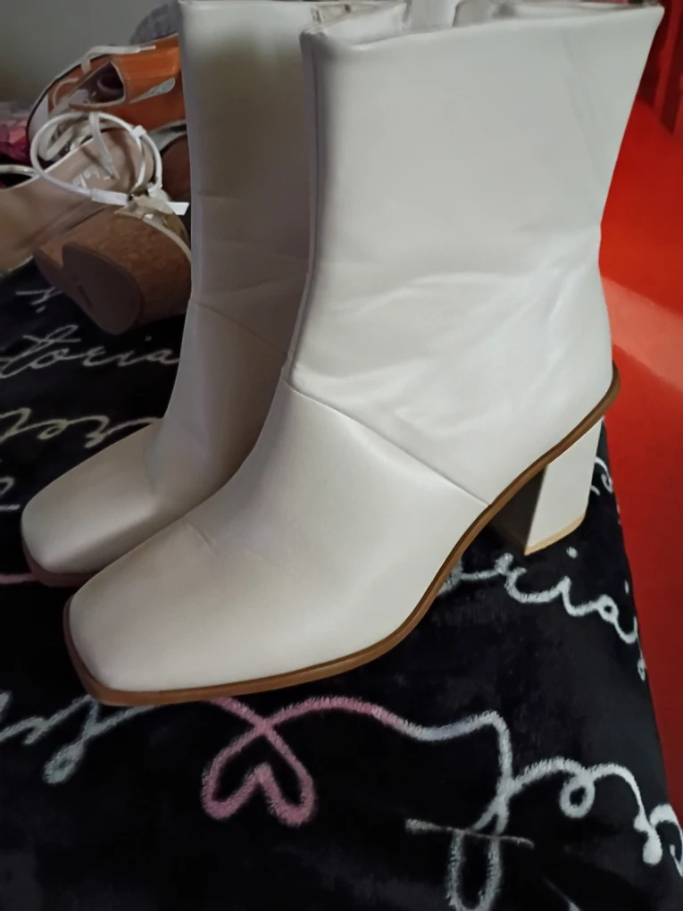 These white ankle boots feature a stylish square toe and a comfortable block heel. They're made from a smooth faux leather material and have a side zipper for easy on and off. Perfect for dressing up or down!