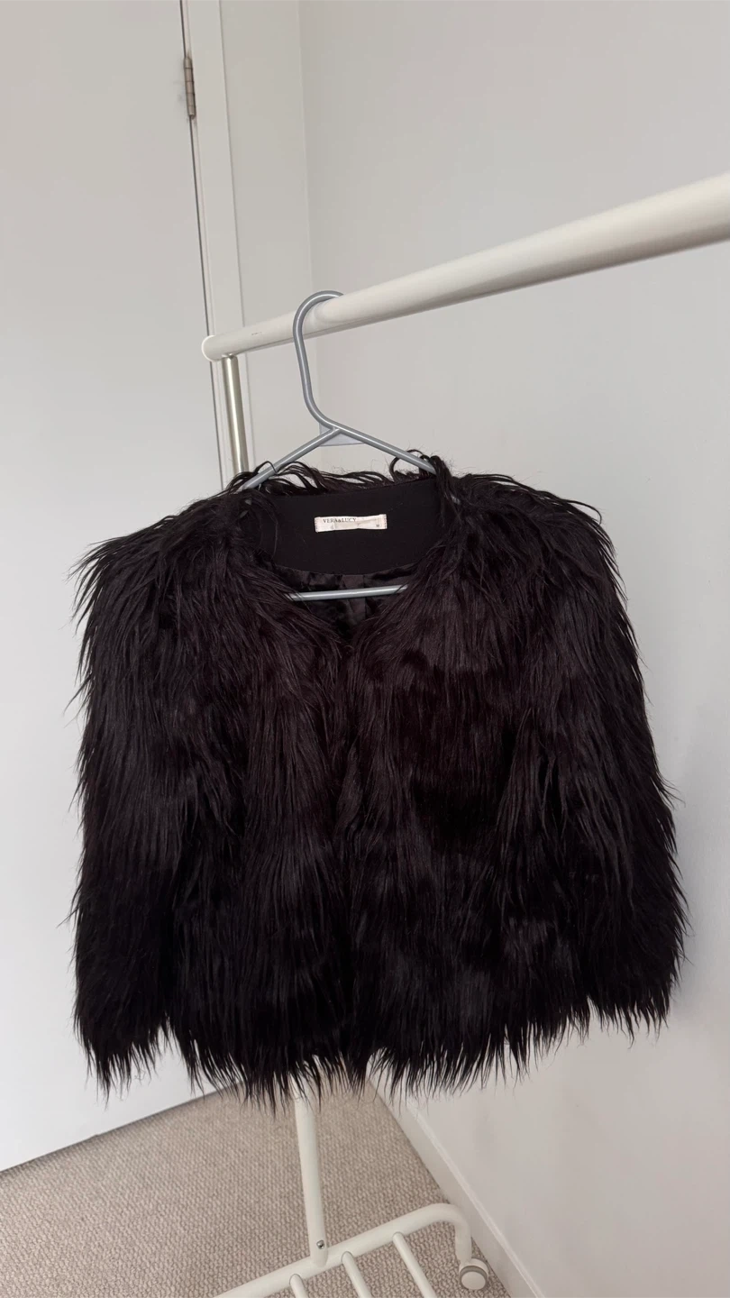 Selling a stylish faux fur jacket in black! It's in great condition and perfect for adding a touch of glam to any outfit. The material is soft and fluffy, making it super cozy for cooler weather