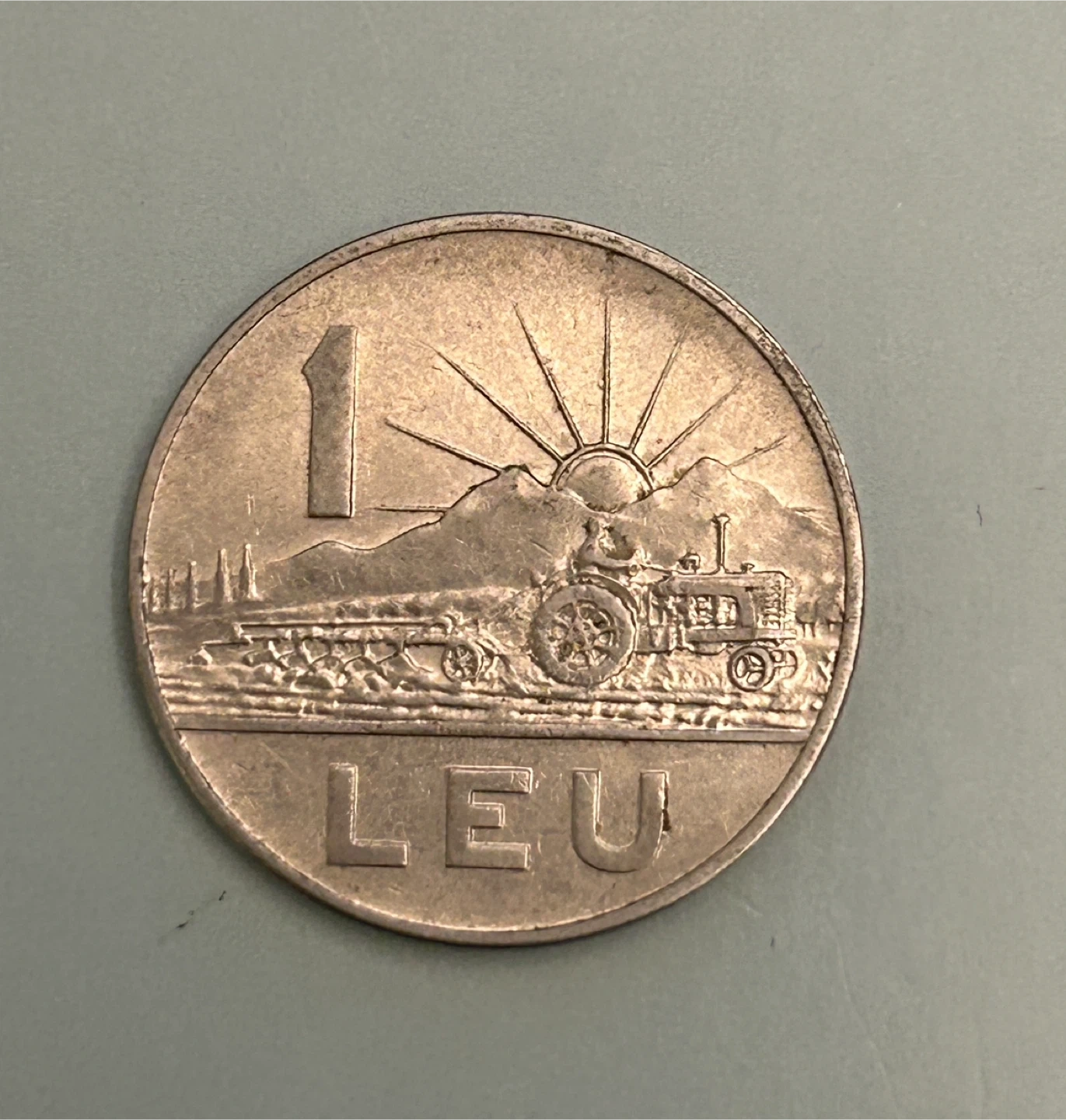 This is a 1 leu coin from the Socialist Republic of Romania, dated 1966. It features a tractor plowing a field on one side and the national emblem on the other. A neat piece of numismatic history!