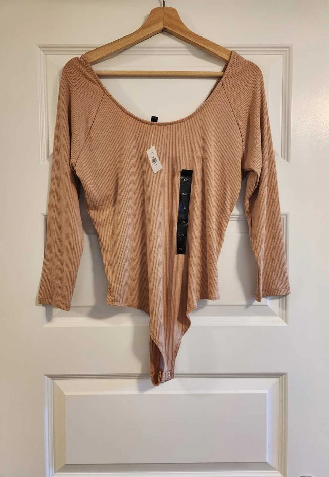 This is a new Banana Republic women's long-sleeve bodysuit in a beautiful tan colour, perfect for layering or wearing on its own!