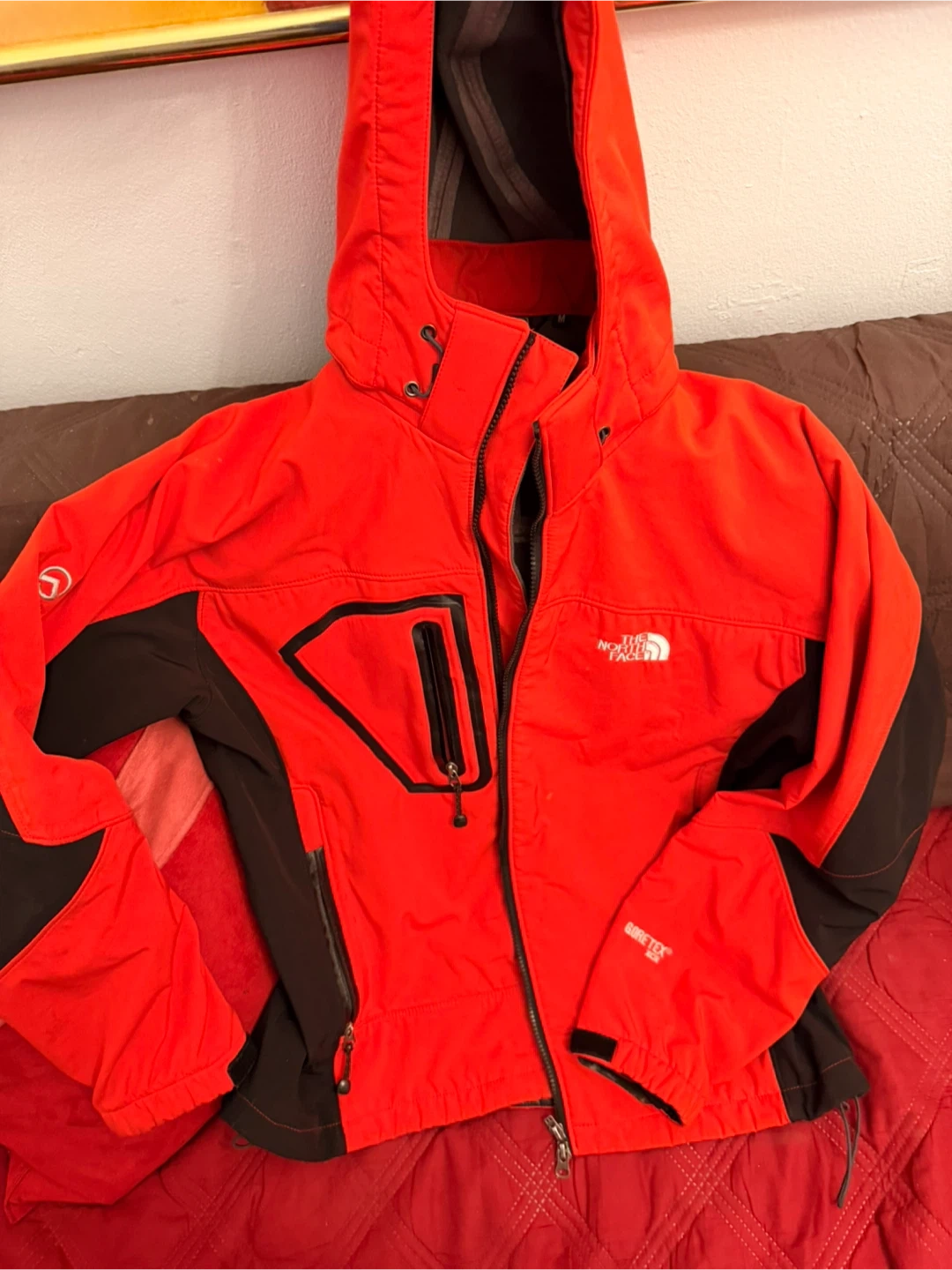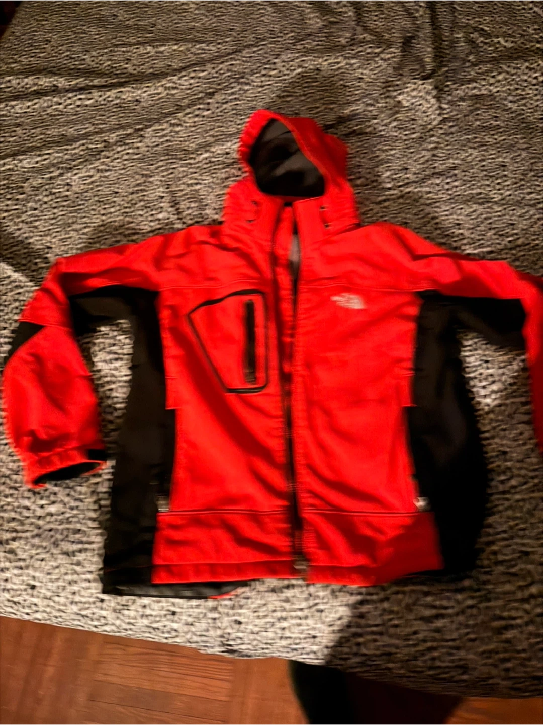 This is The North Face Summit Series jacket. It's made with Gore-Tex for waterproof and breathable protection. It features a bright red exterior with black accents. Several zippered pockets are included for secure storage. This jacket is built for outdoor adventures!