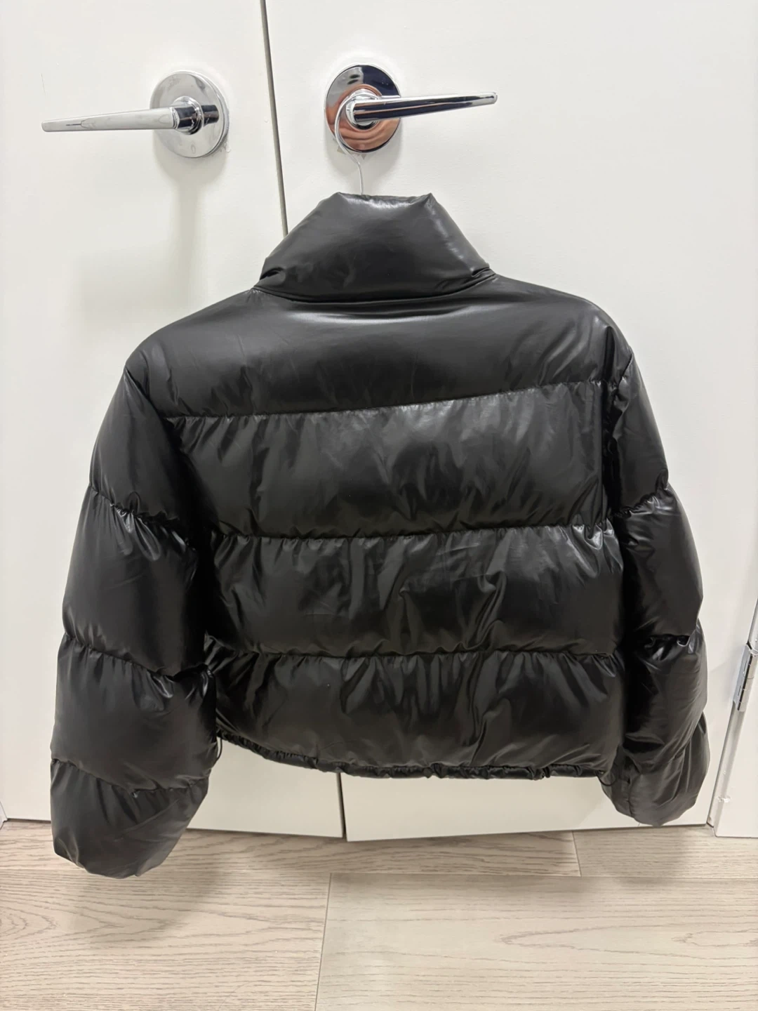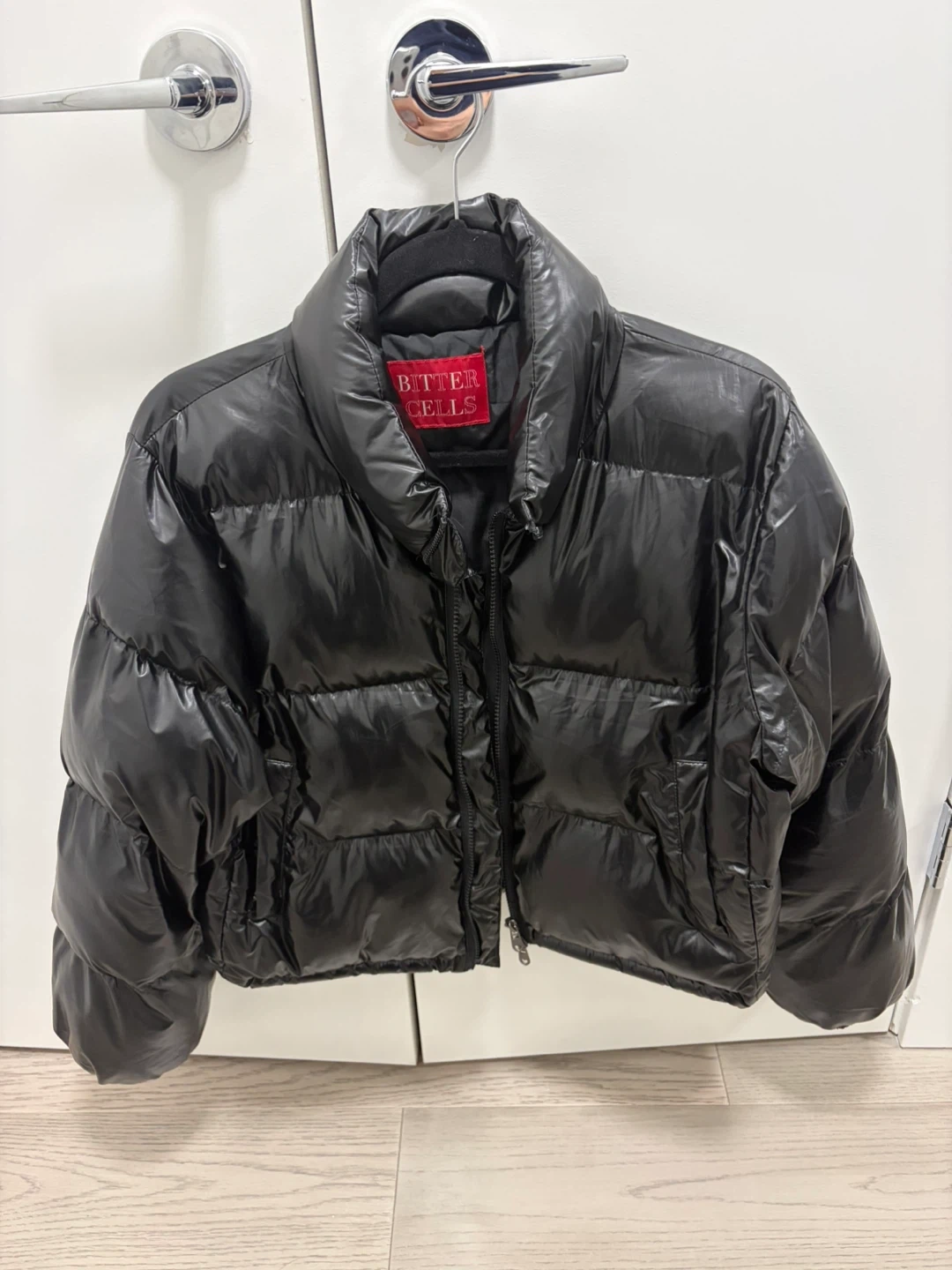 Trendy cropped puffer jacket from Bitter Cells. Features a glossy black finish, high neck collar, and front zip closure. Lightweight yet warm with a padded design. Cropped fit that pairs well with high-waisted jeans or skirts.
