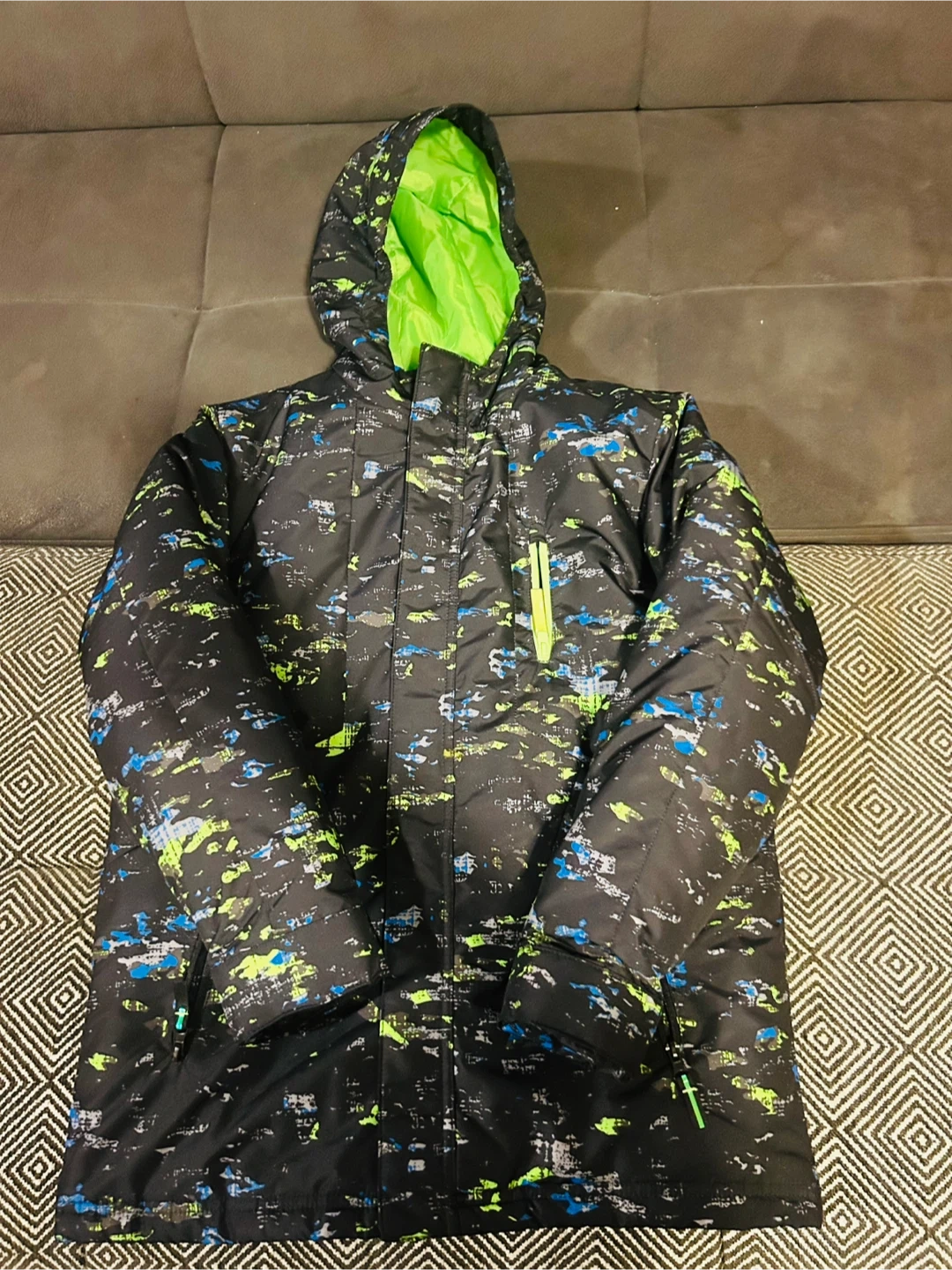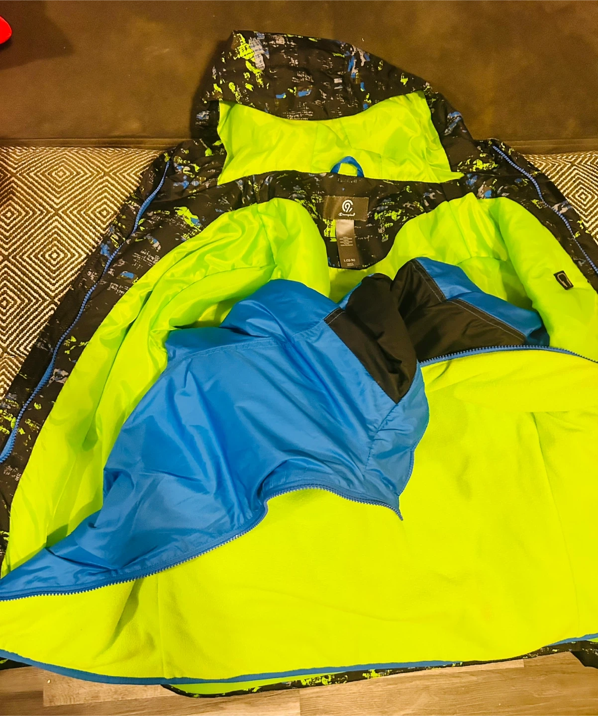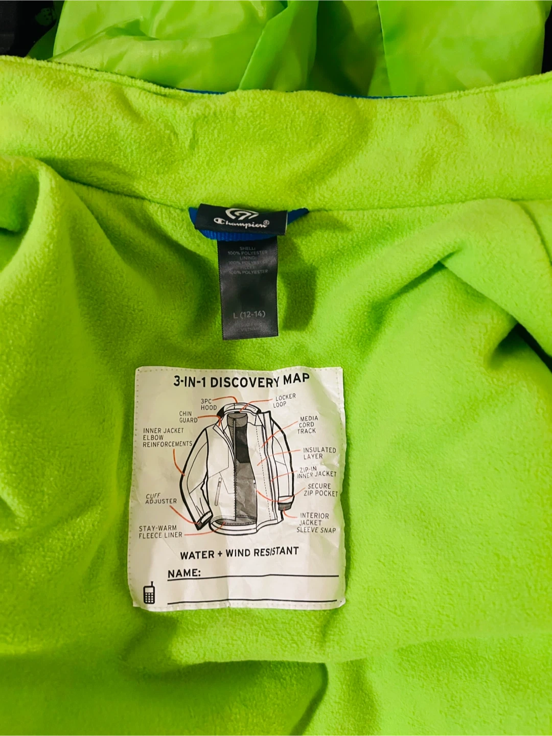 Selling a Champion kids' 3-in-1 jacket in size L (12-14)! The jacket features a black, blue, and green patterned outer shell with a bright green interior lining. It's made of 100% polyester for the shell, lining, and filler. This jacket is water and wind-resistant, perfect for keeping your child warm and dry!