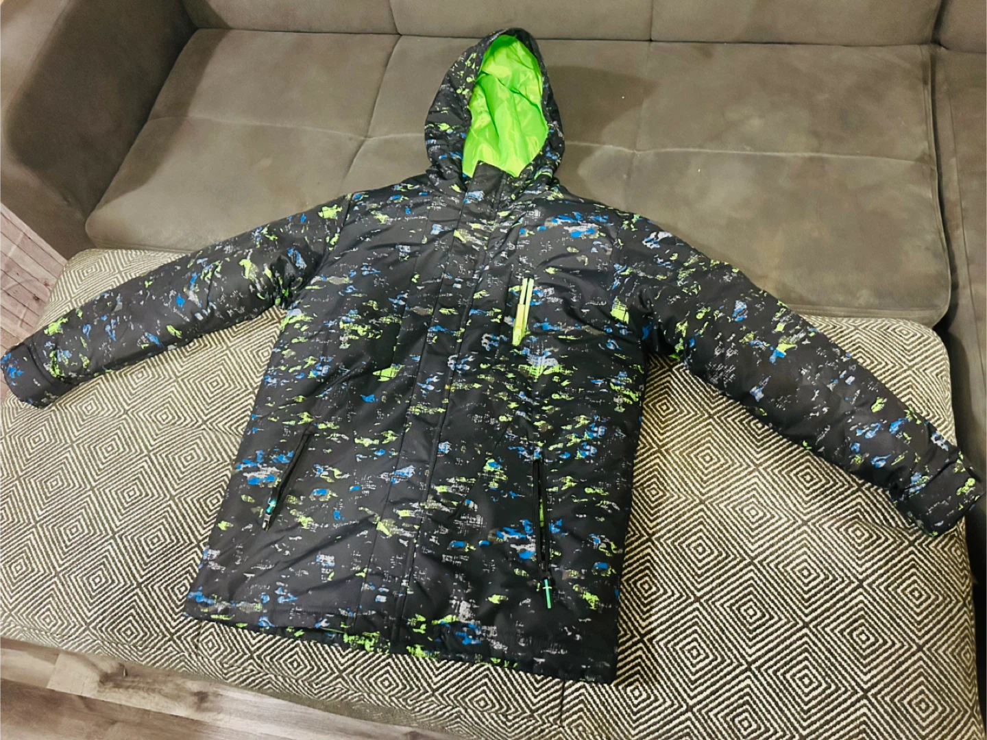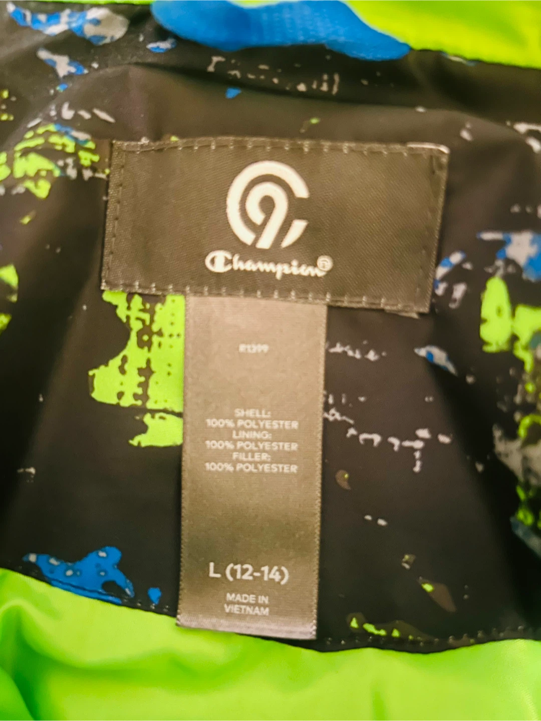 Selling a Champion kids' 3-in-1 jacket in size L (12-14)! The jacket features a black, blue, and green patterned outer shell with a bright green interior lining. It's made of 100% polyester for the shell, lining, and filler. This jacket is water and wind-resistant, perfect for keeping your child warm and dry!