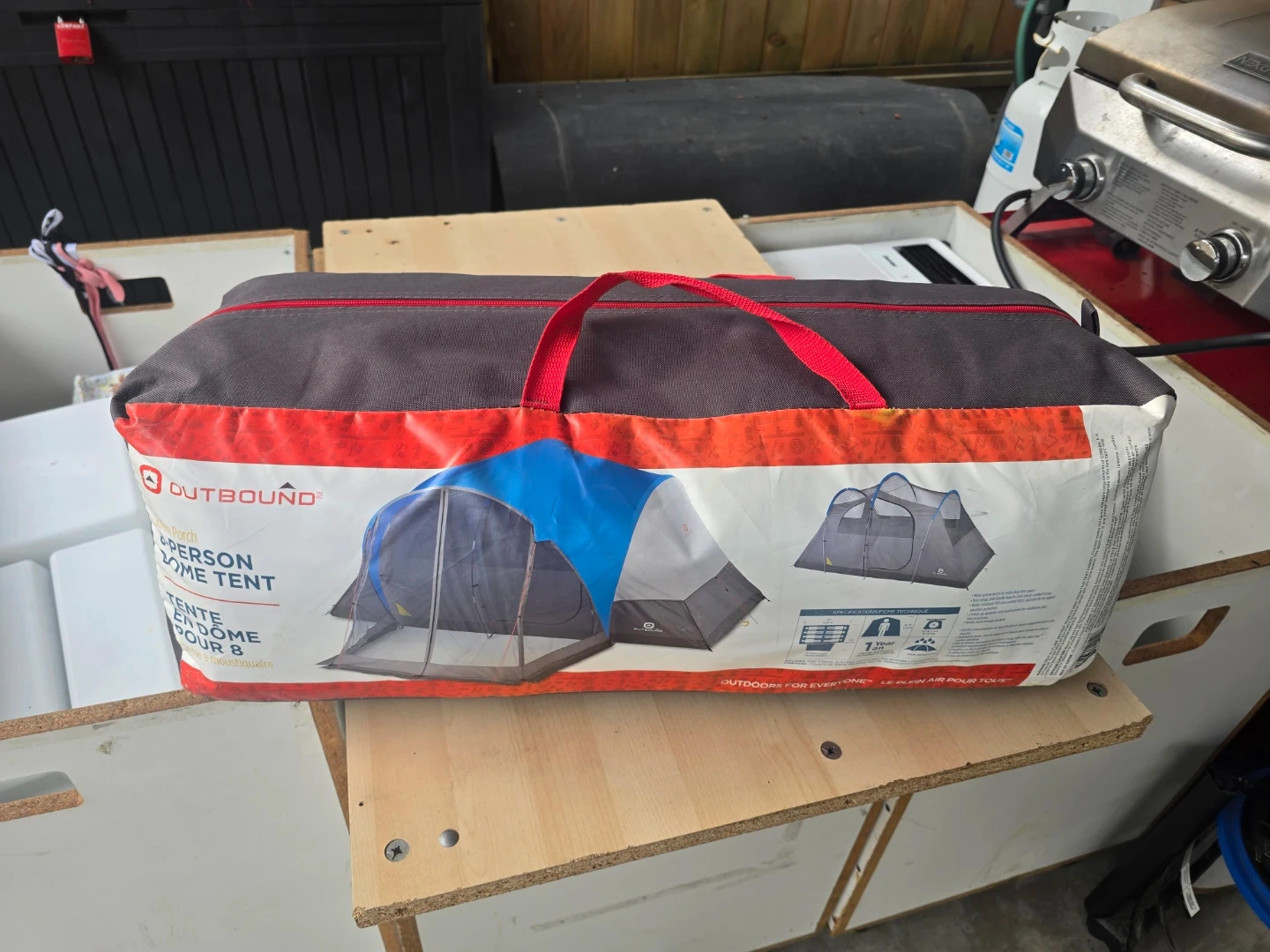 Outbound 8-person dome tent with screen porch. Includes rainfly and carry bag. Great for camping trips and outdoor adventures!