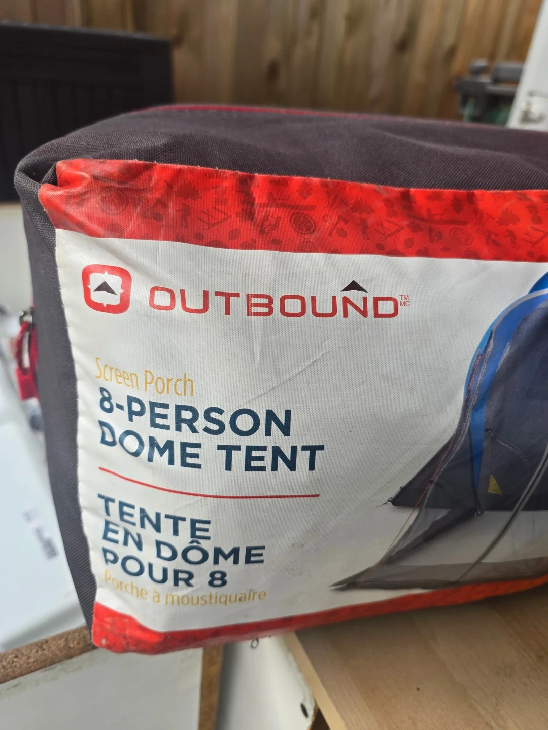 Outbound 8-person dome tent with screen porch. Includes rainfly and carry bag. Great for camping trips and outdoor adventures!