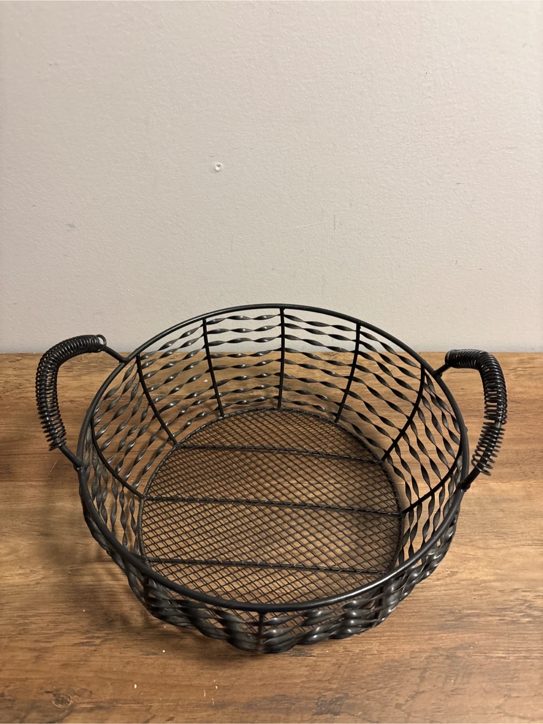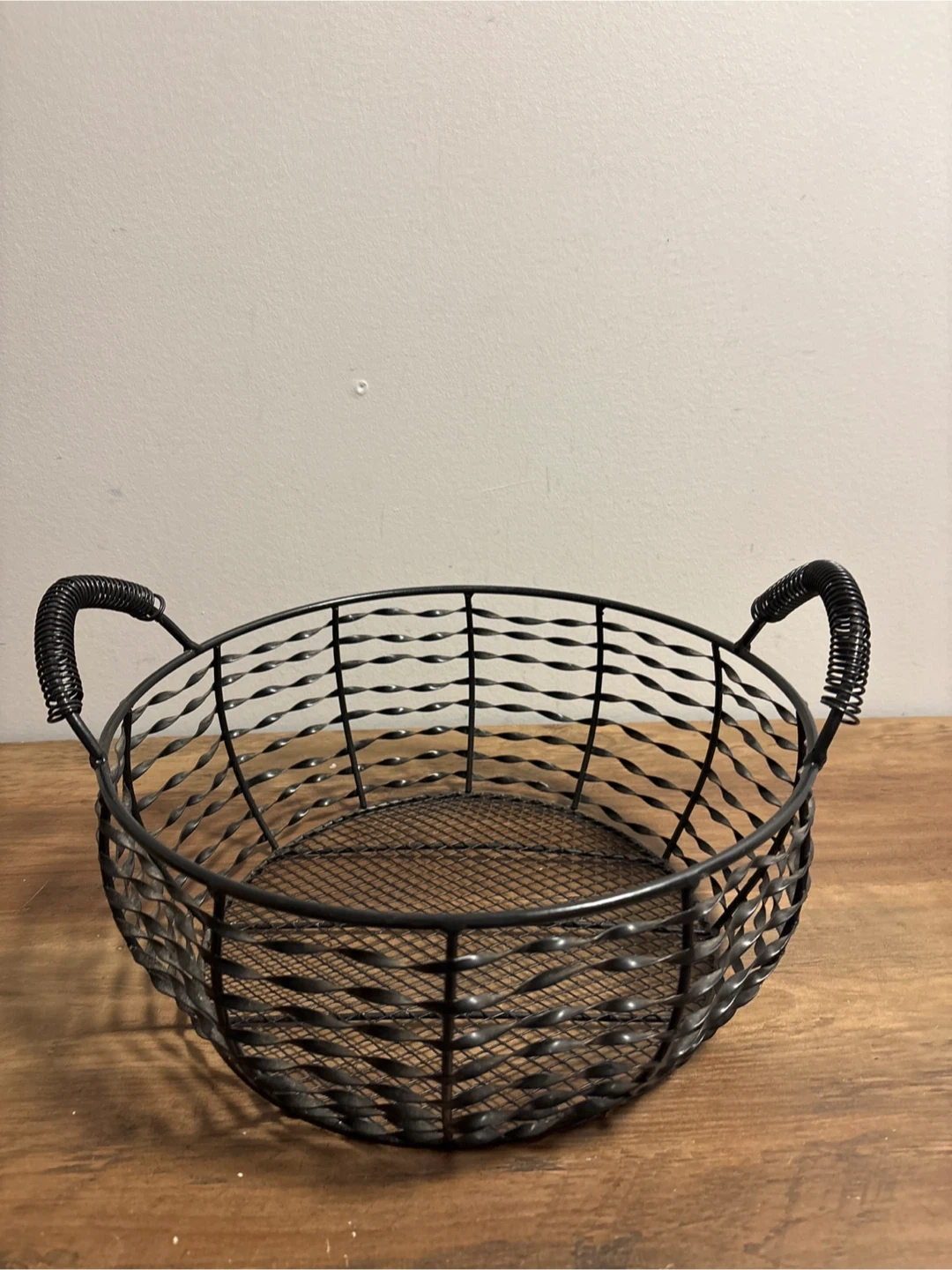 This is a round wire basket with a mesh bottom and two decorative handles. It's great for storing or displaying various items. Wire construction.