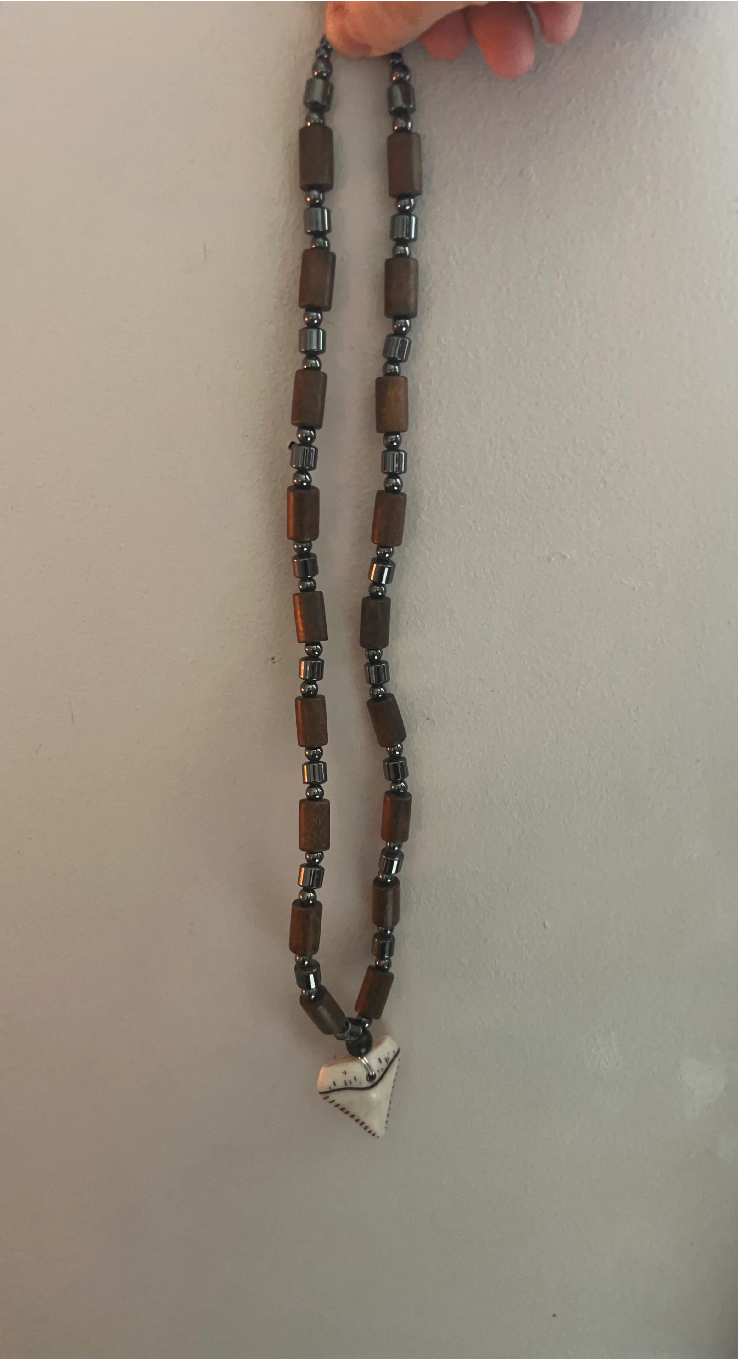 Here's a cool necklace featuring wooden and hematite beads, finished with a shark tooth pendant. It's a unique piece that would add some character to any outfit! (NOT REAL TOOTH)