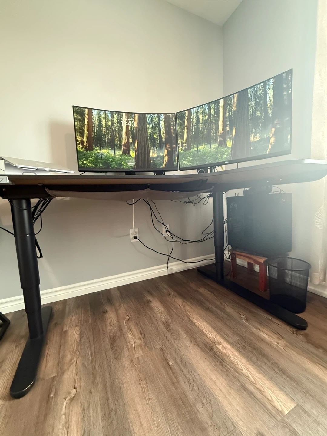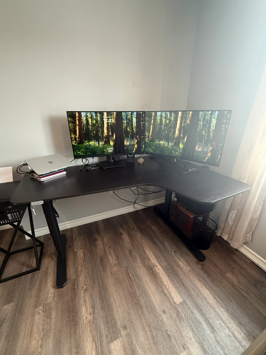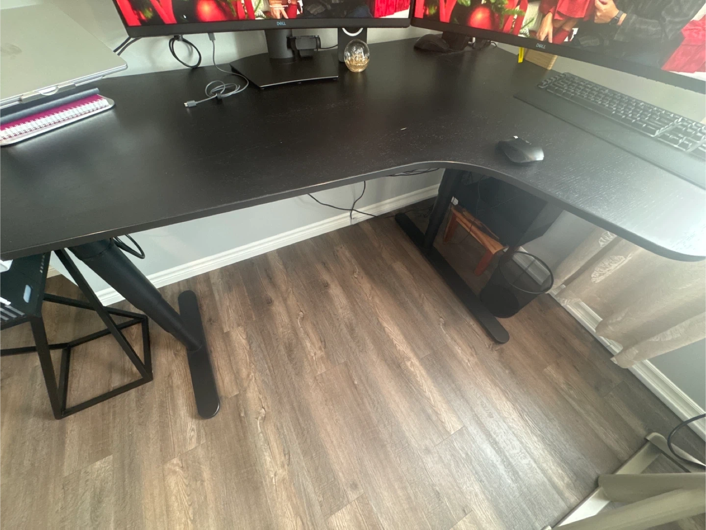 Spacious L-shaped standing desk in excellent condition. Minimal signs of use. Perfect for a dual-monitor setup or a large home office workspace.