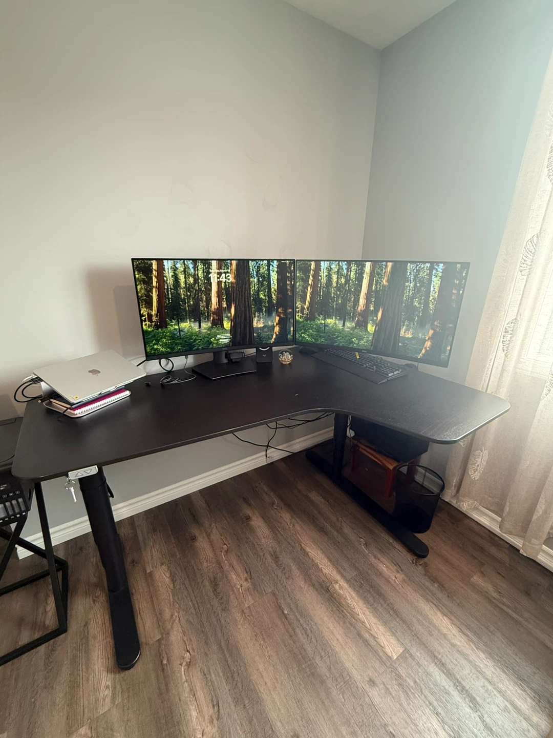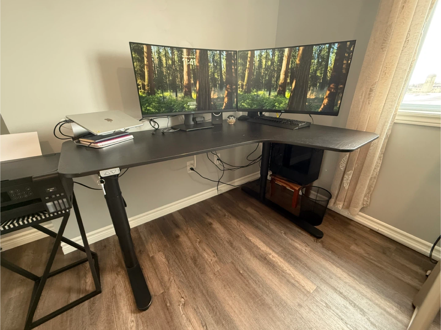 Spacious L-shaped standing desk in excellent condition. Minimal signs of use. Perfect for a dual-monitor setup or a large home office workspace.