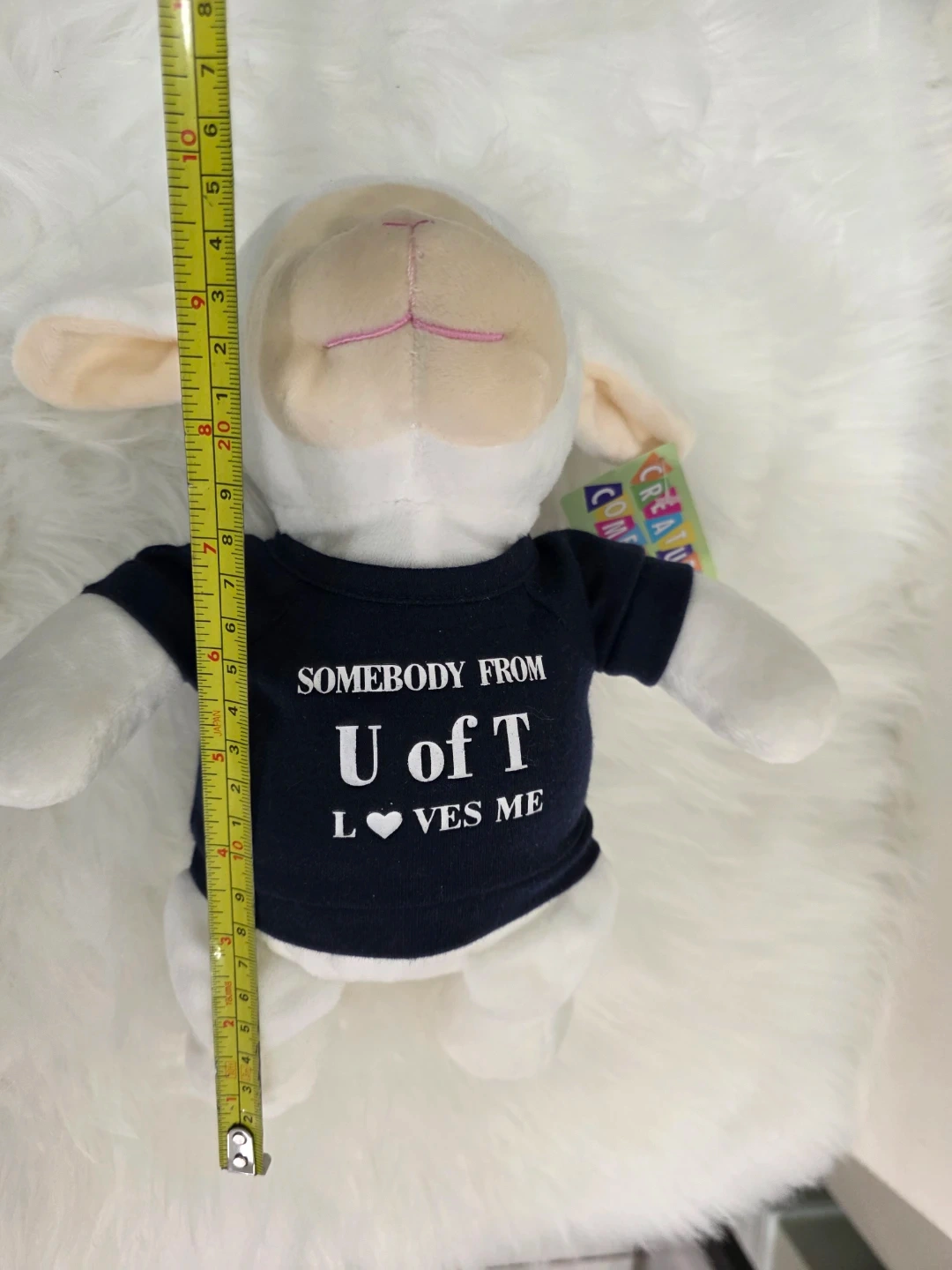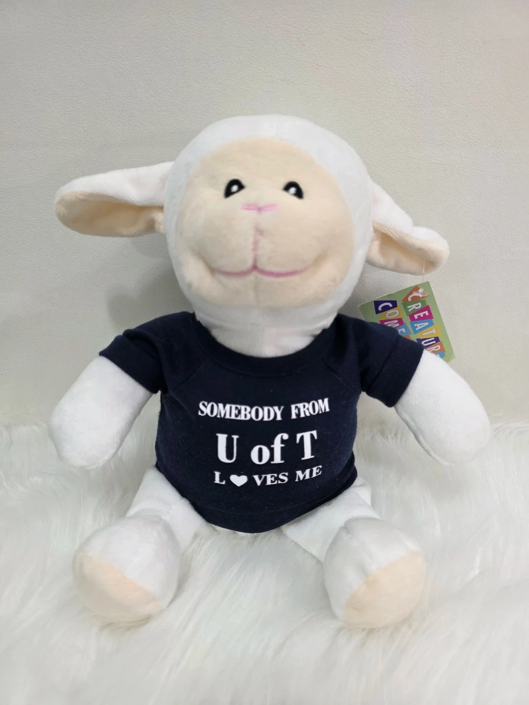 Cute lamb plushie wearing a "Somebody from U of T Loves Me" t-shirt! It's about 10 inches tall and in great condition. Perfect for any University of Toronto fan or as a souvenir