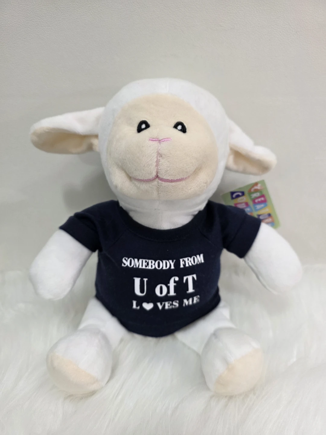 Cute lamb plushie wearing a "Somebody from U of T Loves Me" t-shirt! It's about 10 inches tall and in great condition. Perfect for any University of Toronto fan or as a souvenir